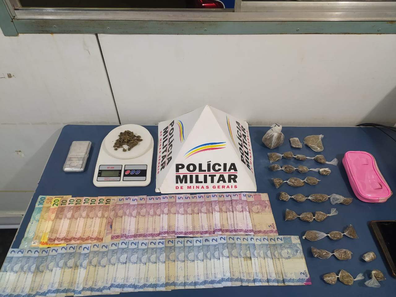 Durante as buscas pessoais e na residência de um dos envolvidos - alvo de denúncias de tráfico - foram localizadas 28 buchas de maconha, R$406,00, 02 balanças de precisão e 06 aparelhos celulares.