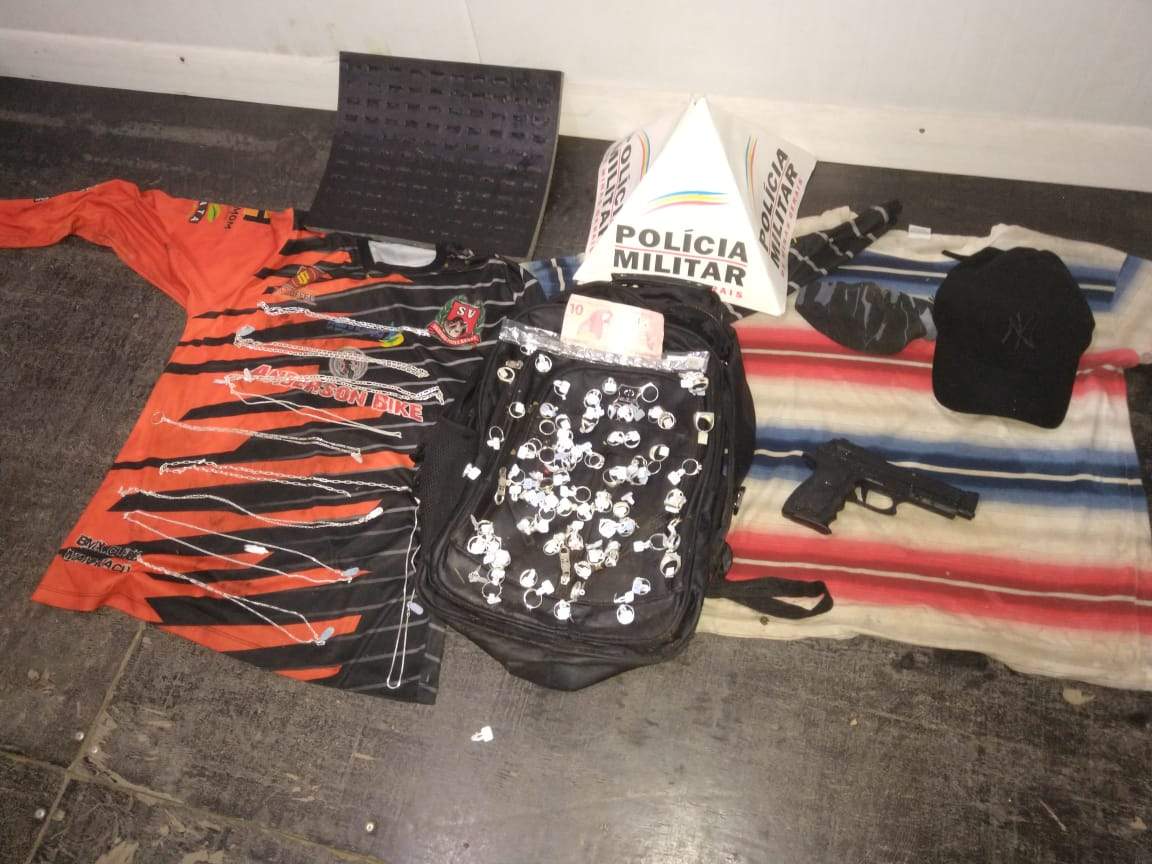Eles ainda estavam em posse de todo material roubado e do simulacro de pistola. Foram recuperados 94 anéis, 10 cordões e 01 pulseira. O autor de 19 anos e o menor infrator de 16 foram conduzidos até a Delegacia de Polícia Civil, juntamente com os materiais, onde foi autuado o flagrante do maior pelo Delegado de Polícia.