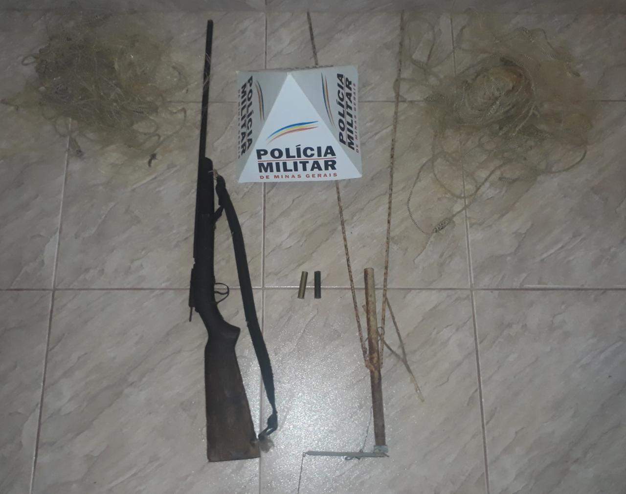 Os militares localizaram uma espingarda, tipo polveira, uma armadilha comumente usada para matar animais silvestres conhecida como “canhão toquinho” calibre 32; dois cartuchos calibre 32, sendo um deflagrado e outro intacto e 02 duas redes de pesca de malha.