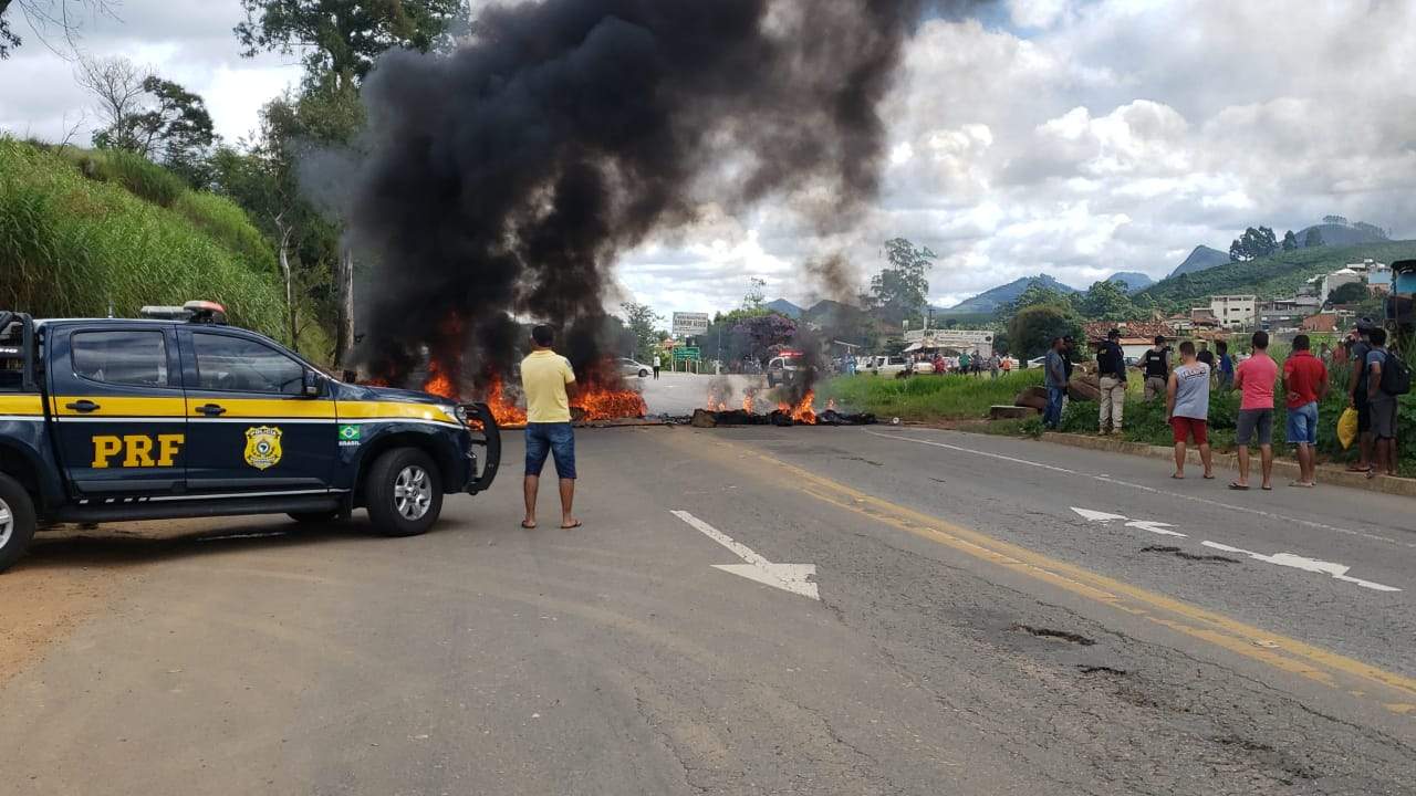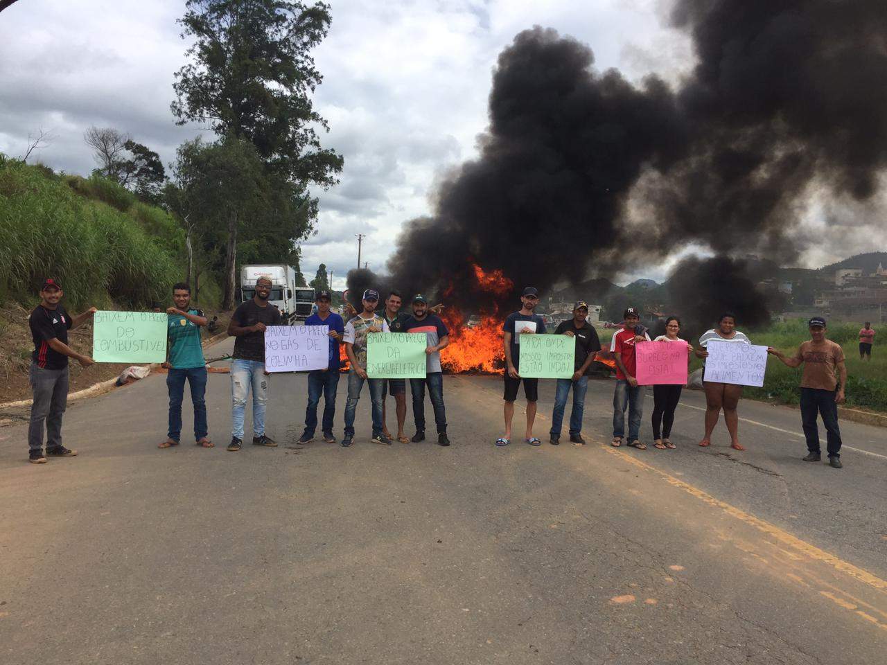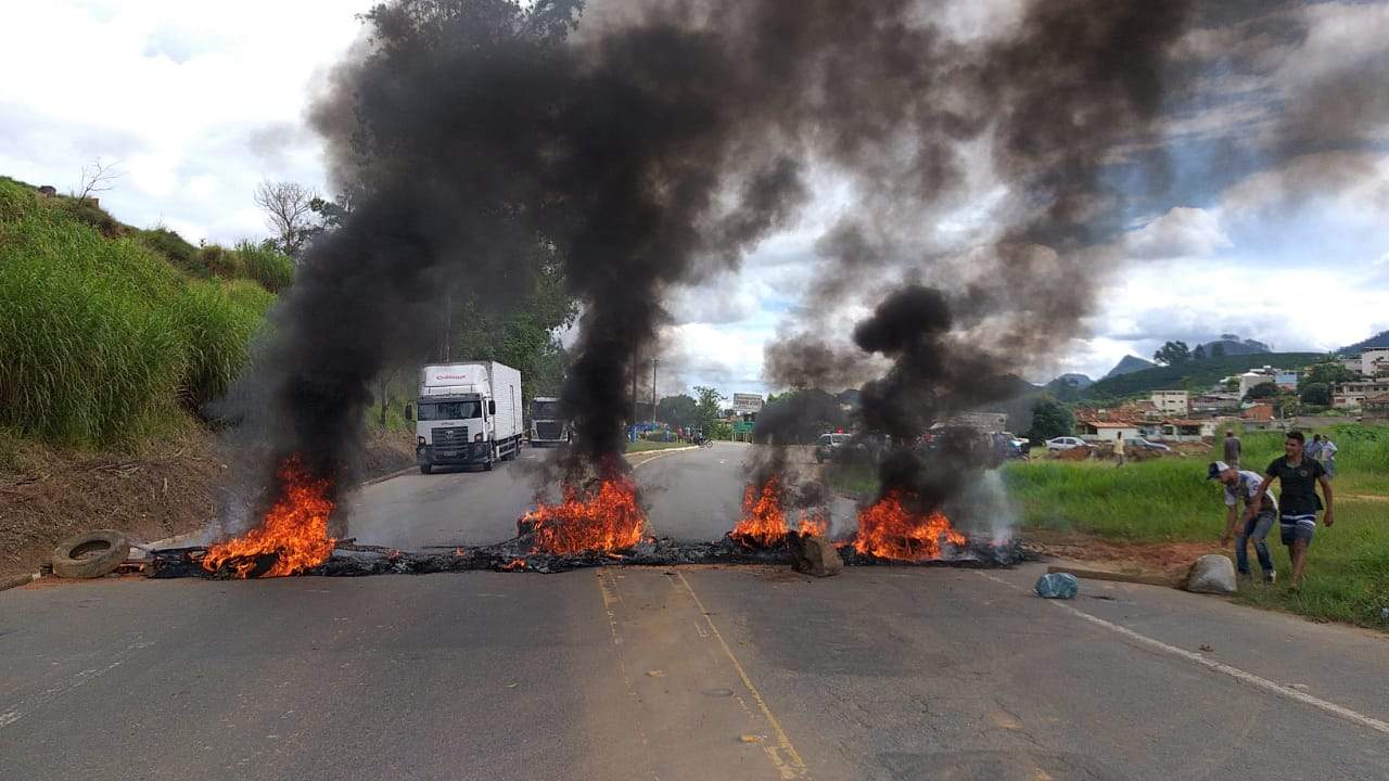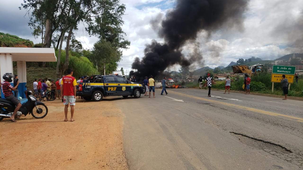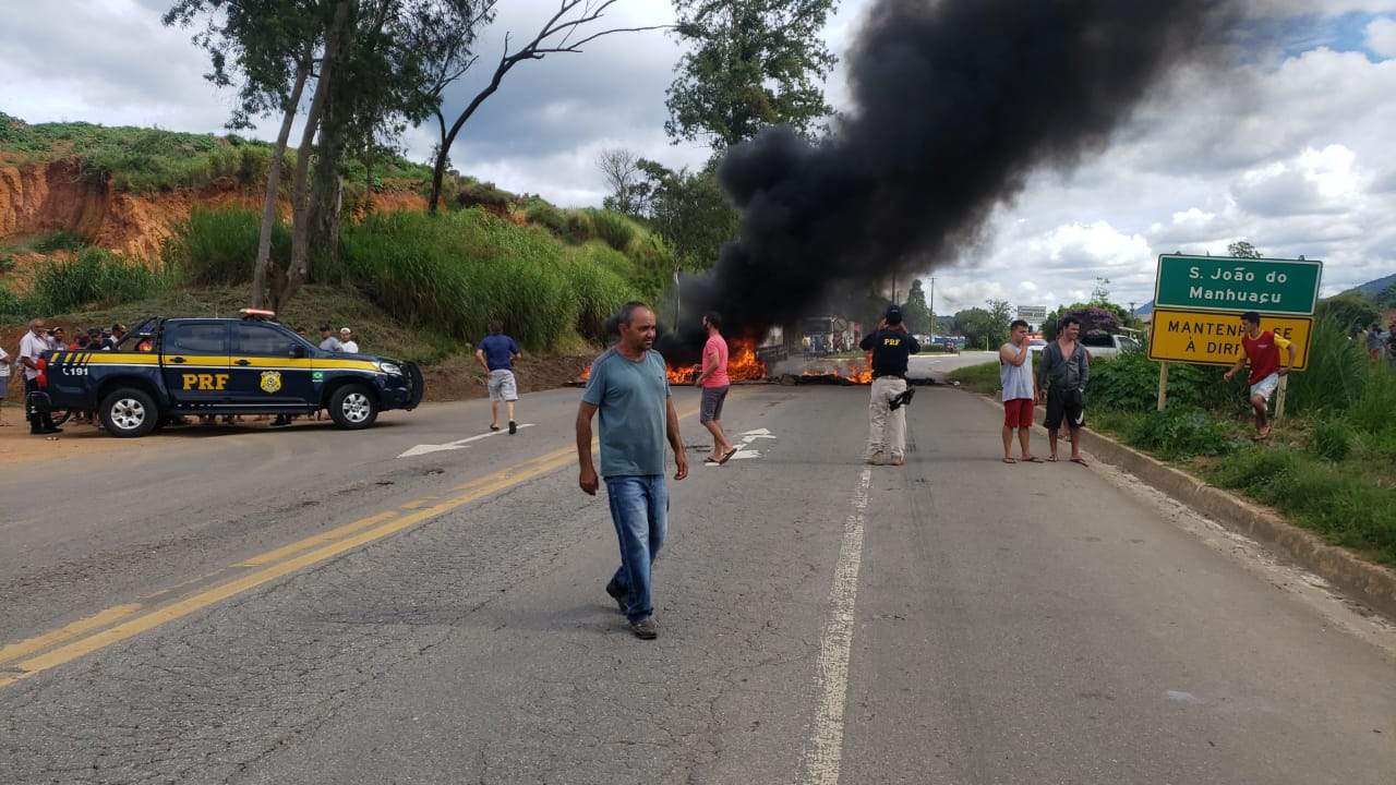 SÃO JOÃO DO MANHUAÇU (MG) - Moradores e motoristas fecharam durante a tarde a BR-116, no trevo de São João do Manhuaçu, na tarde deste sábado, 27/02.