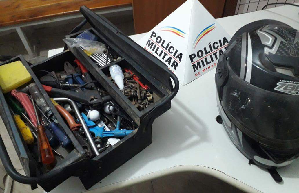 Durante patrulhamento pela Rua Sebastião Alves de Almeida, bairro Lajinha, nesta quinta-feira, 11/03, equipe policial avistou um rapaz, contumaz na prática de crimes contra o patrimônio, carregando uma caixa de ferramentas e um capacete.