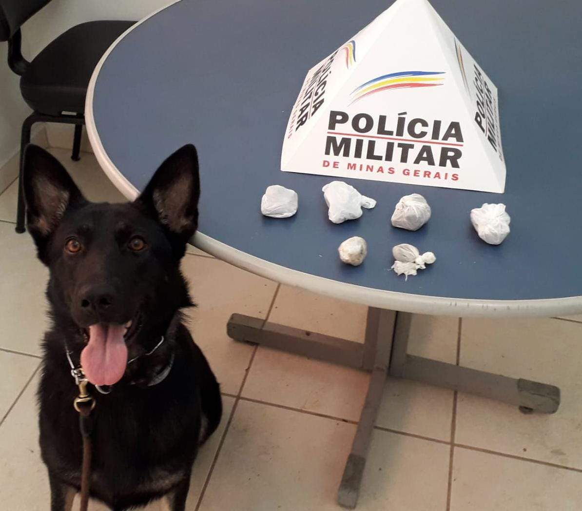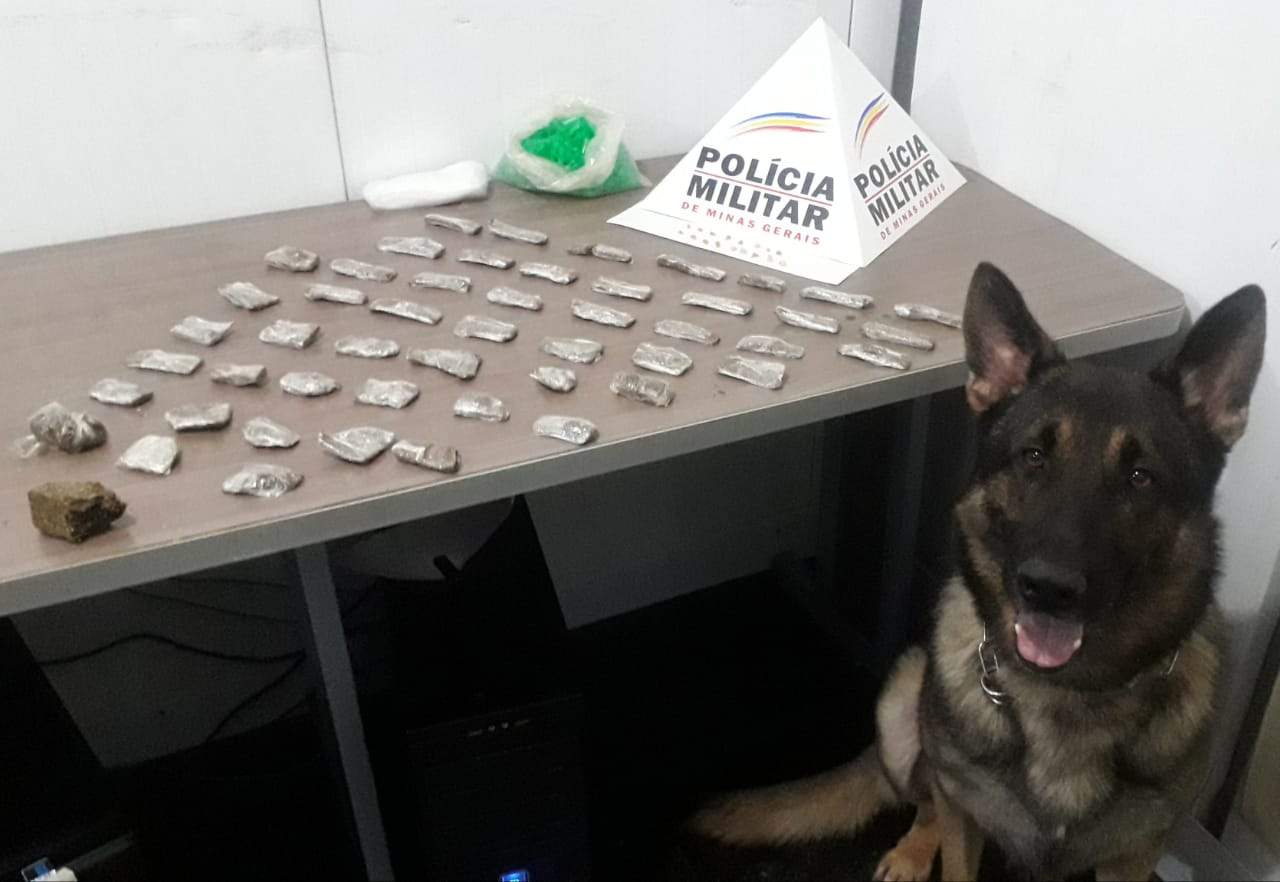 A cadela de faro Kacau foi utilizada, na avenida Hervê Cordovil, e localizou duas buchas e quatro tabletes de maconha.