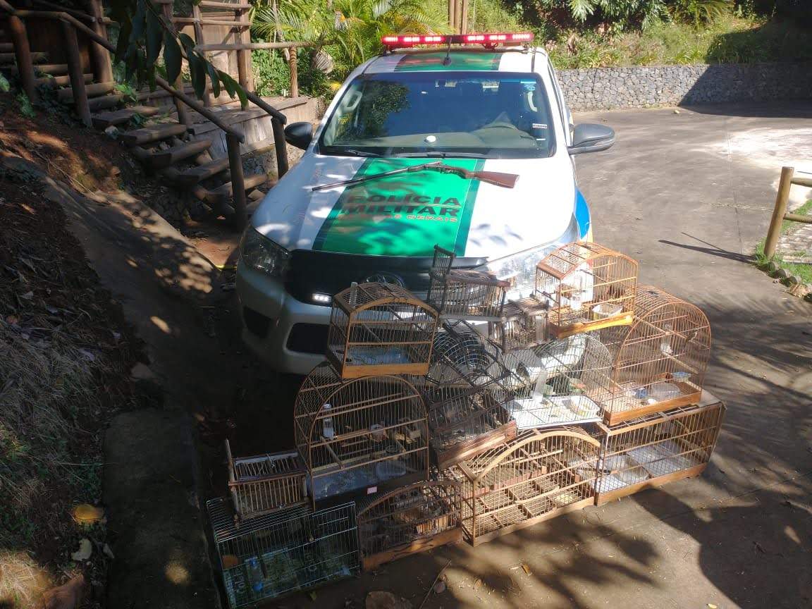 O morador denunciado possuía alguns pássaros regulares, mas alegou ter capturados vários outros na natureza, mantendo-os em cativeiro. Também foi localizada uma espingarda, calibre 32, sem registro.