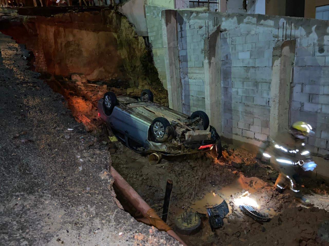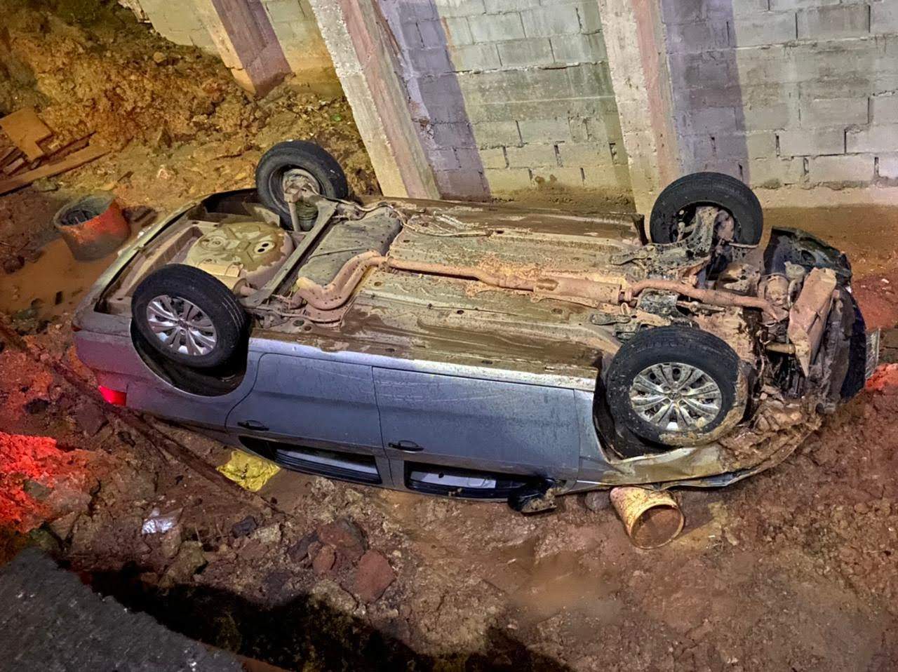 Segundo o Corpo de Bombeiros, foram acionados por volta de 19:45. O carro caiu de um barranco de uma altura de cerca de cinco metros, na obra inacabada, e capotou.