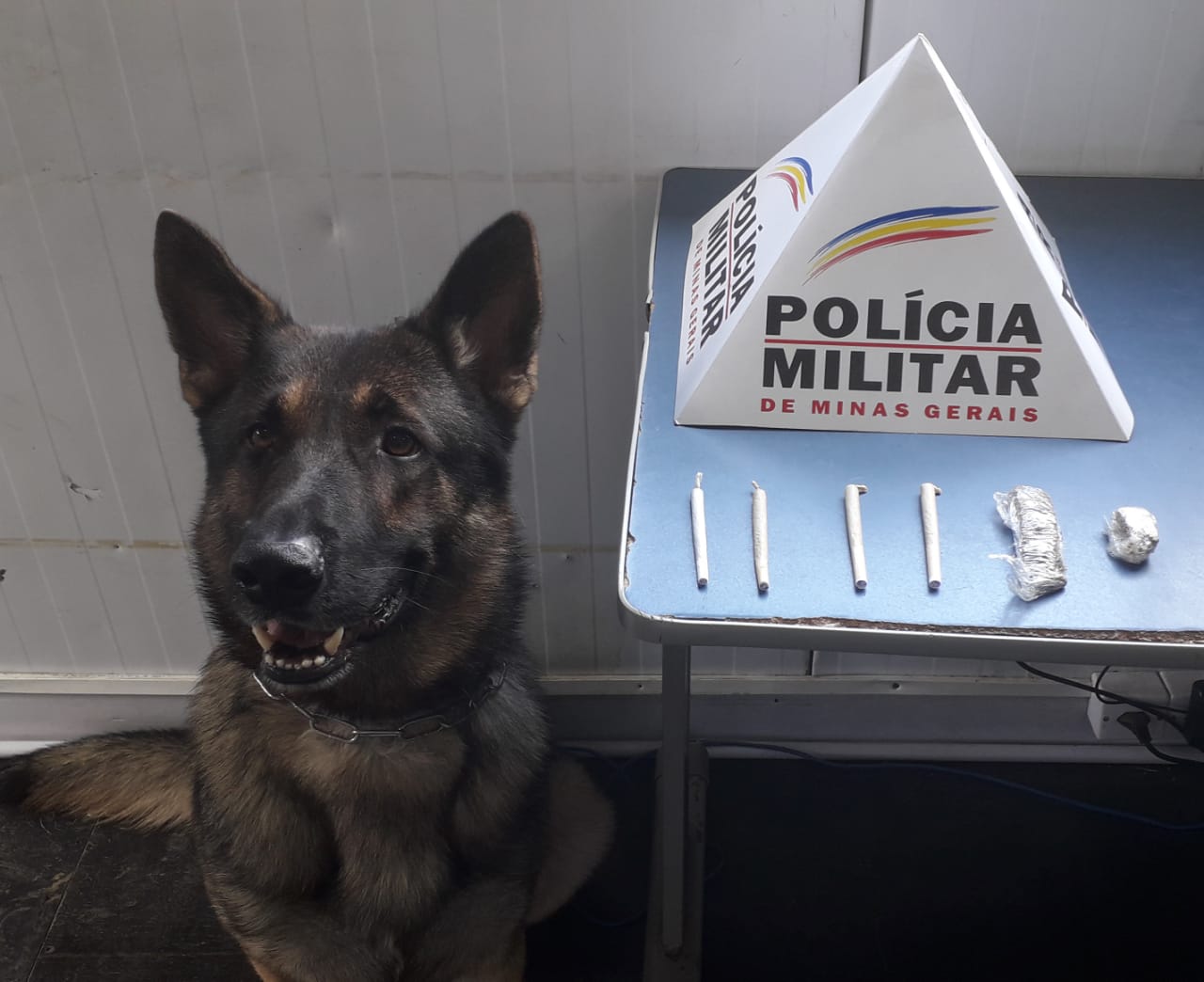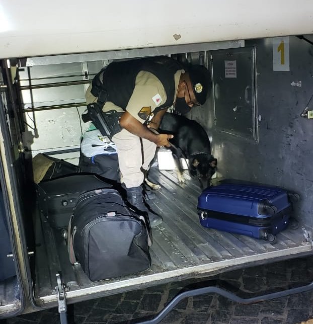 Foram abordados diversos veículos e passageiros, sendo empregados os cães farejadores Aquiles e Kacau e localizados nos pertences de um dos passageiros, 02 tabletes e 04 cigarros de maconha.