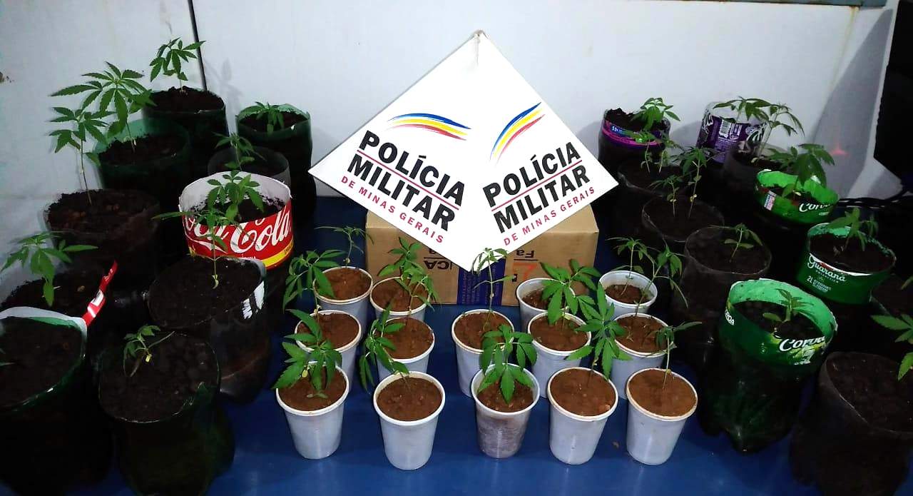 No local, os policiais realizaram cerco ao imóvel, fizeram contato com o denunciado e durante as buscas foram localizados no terraço da casa, 35 pés de maconha.
