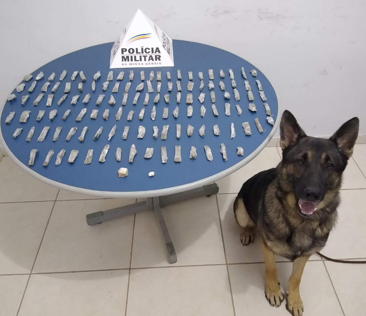 Foi aplicado o cão farejador Aquiles no percurso feito pelos suspeitos e ele indicou que havia drogas numa casa desabitada. No imóvel foram encontrados 122 tabletes de maconha, 01 pedra bruta de crack e 01 porção de crack.