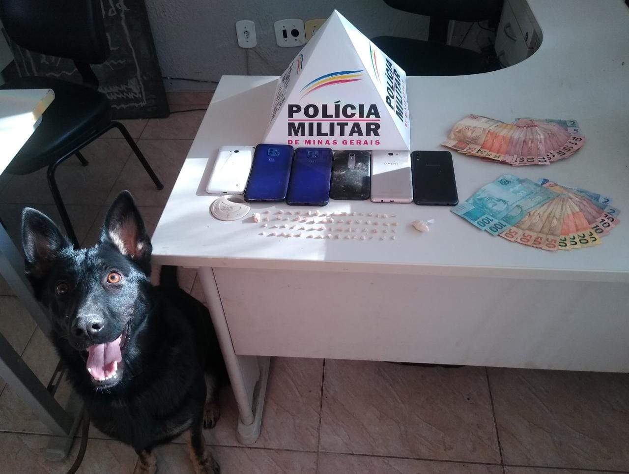 Durante as buscas , foi aplicada a cadela de faro Kacau. Foram encontradas 60 pedras de crack, além de 01 pedra bruta e mais 01 porção de crack e a quantia de R$ 874,00.