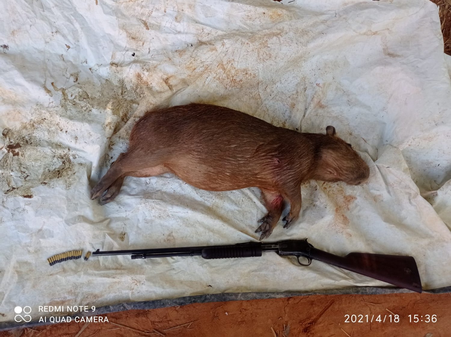 Durante a busca pessoal, os militares localizaram 19 munições calibre 22 em uma pochete. No interior do veículo, foi localizada uma espingarda marca Rossi calibre 22, municiada com mais 4 munições calibre 22. Na vistoria realizada no automóvel, foi encontrada no bagageiro, uma capivara, animal da fauna silvestre, já abatida com marca de perfuração por disparo de arma de fogo, apontando que o autor havia acabado de realizar o ato de caça predatória de animal silvestre.
