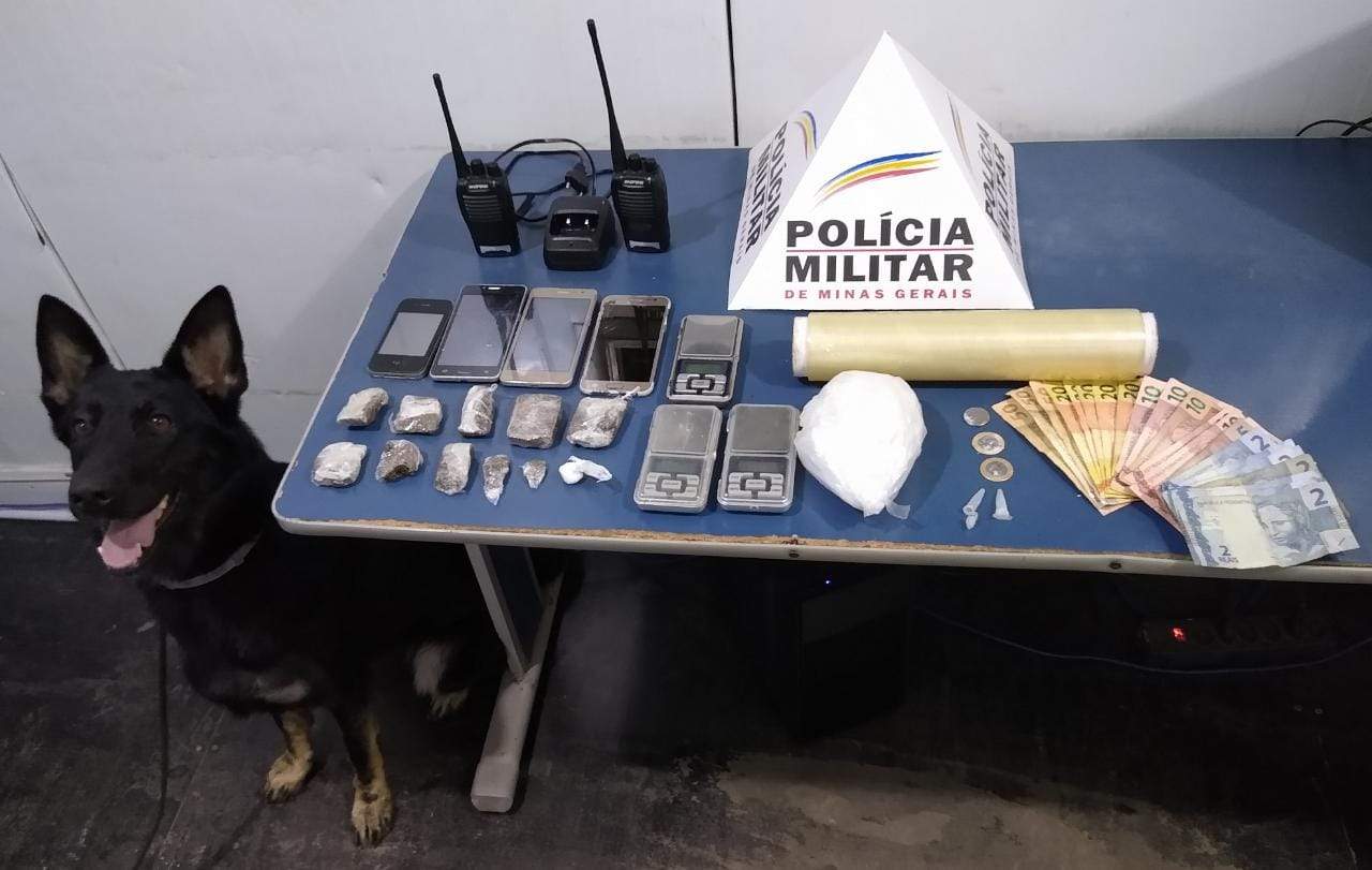 Durante as buscas, foi aplicada a cadela de faro Kacau e localizados 09 tabletes e 01 bucha de maconha, 01 papelote de cocaína, balanças de precisão, aparelhos celulares, rádios comunicadores, R$333,00, além de 03 bicicletas, 01 quadro de bicicleta e materiais para embalar drogas.