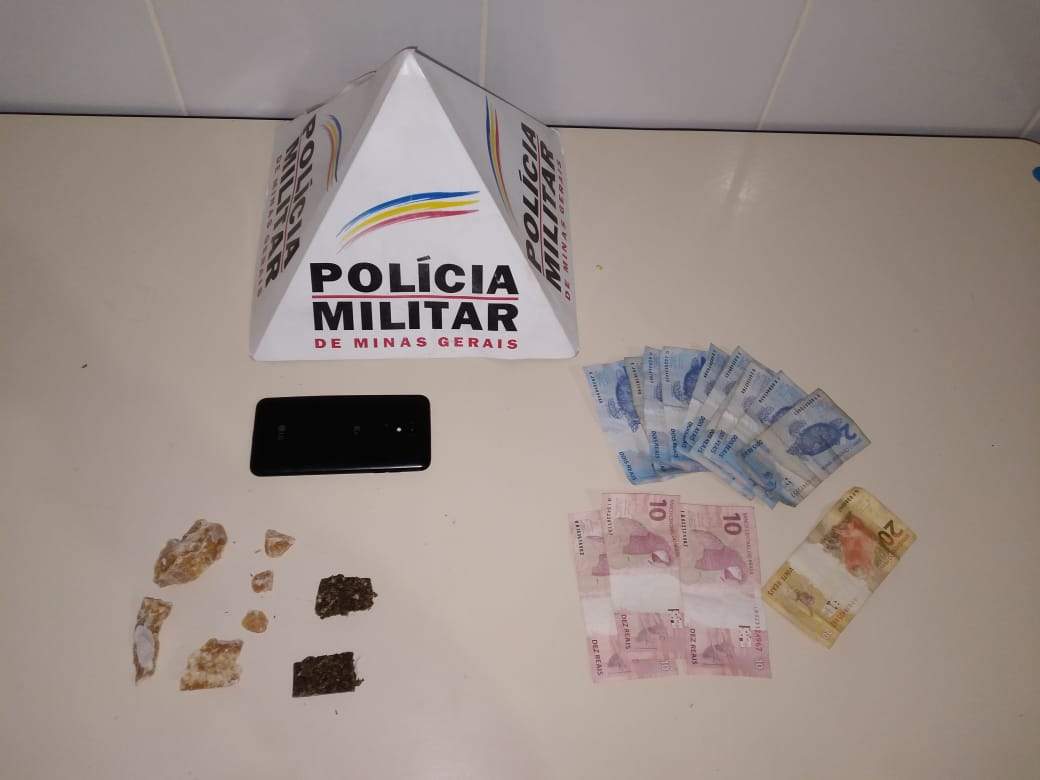 Foram localizadas 06 pedras brutas de crack, 02 tabletes de maconha, 01 aparelho celular e R$70,00.