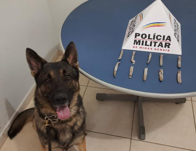 O cão farejador indicou a localização de 10 tabletes de maconha. Os materiais foram apreendidos e encaminhados à Delegacia de Polícia Civil.