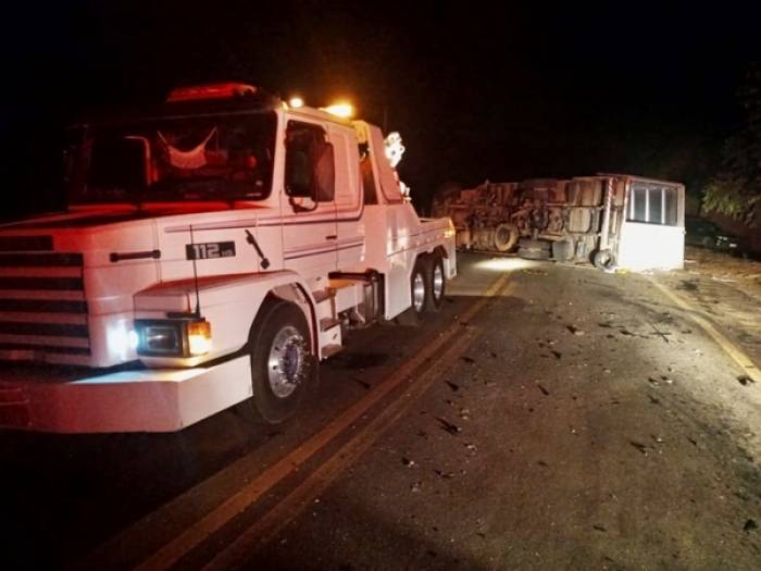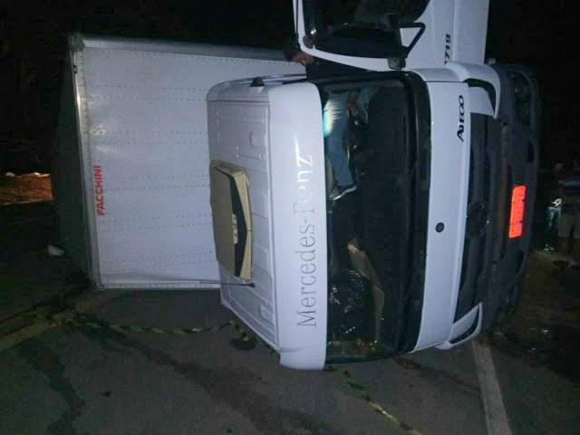 Com o impacto a carga do caminhão ficou tombada na pista. O trânsito ficou interditado até a chegada de um guincho para retirar os destroços.