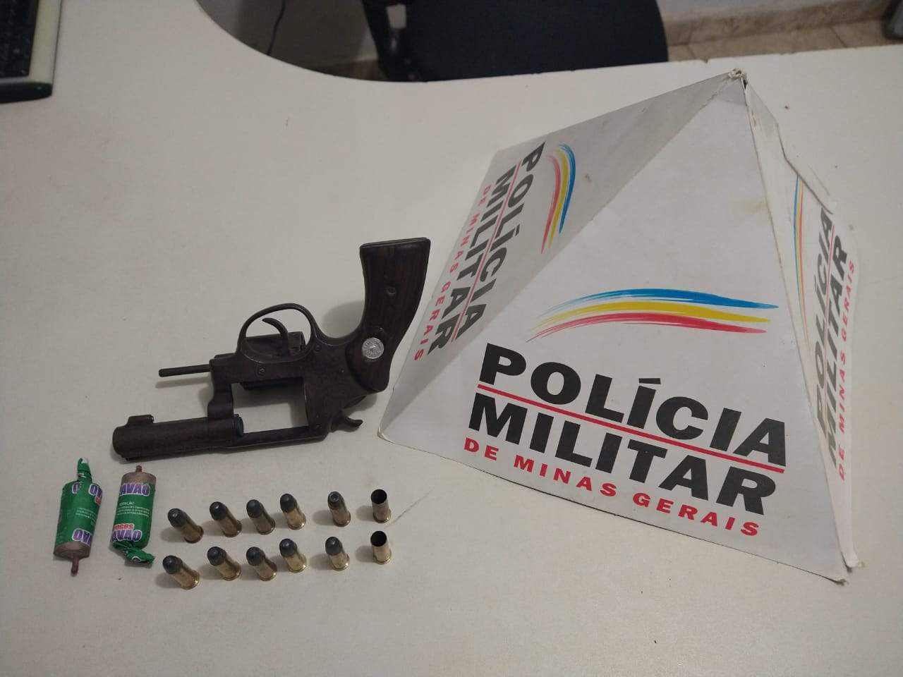 Na casa, foi localizada a arma de fogo, um revólver calibre .38, além de 10 cartuchos intactos e dois deflagradas.