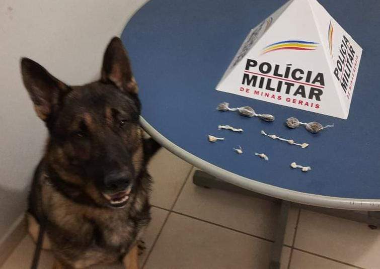 O cão Aquiles indicou 10 pedras e 01 porção de crack e 05 buchas de maconha escondidas em buracos de paredes e em cima de calha de residência.