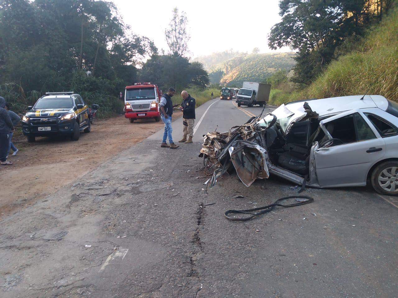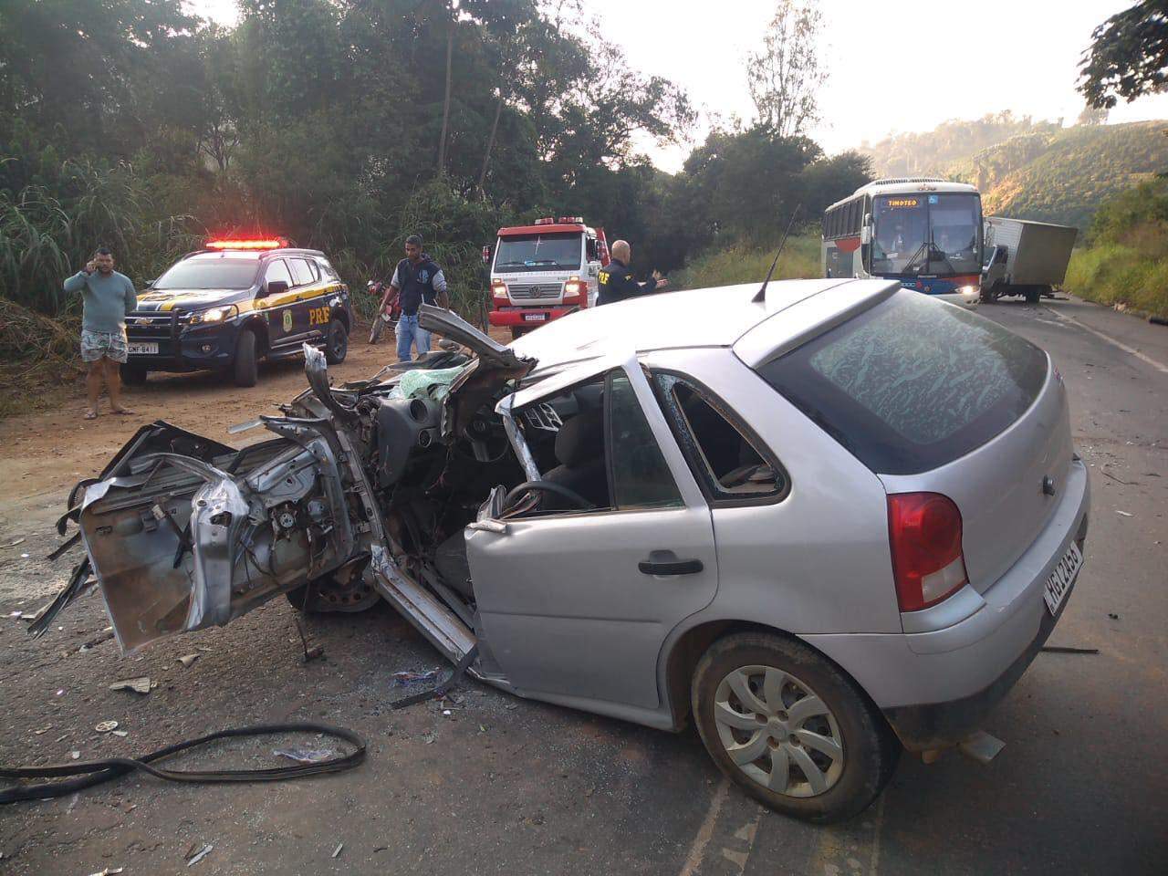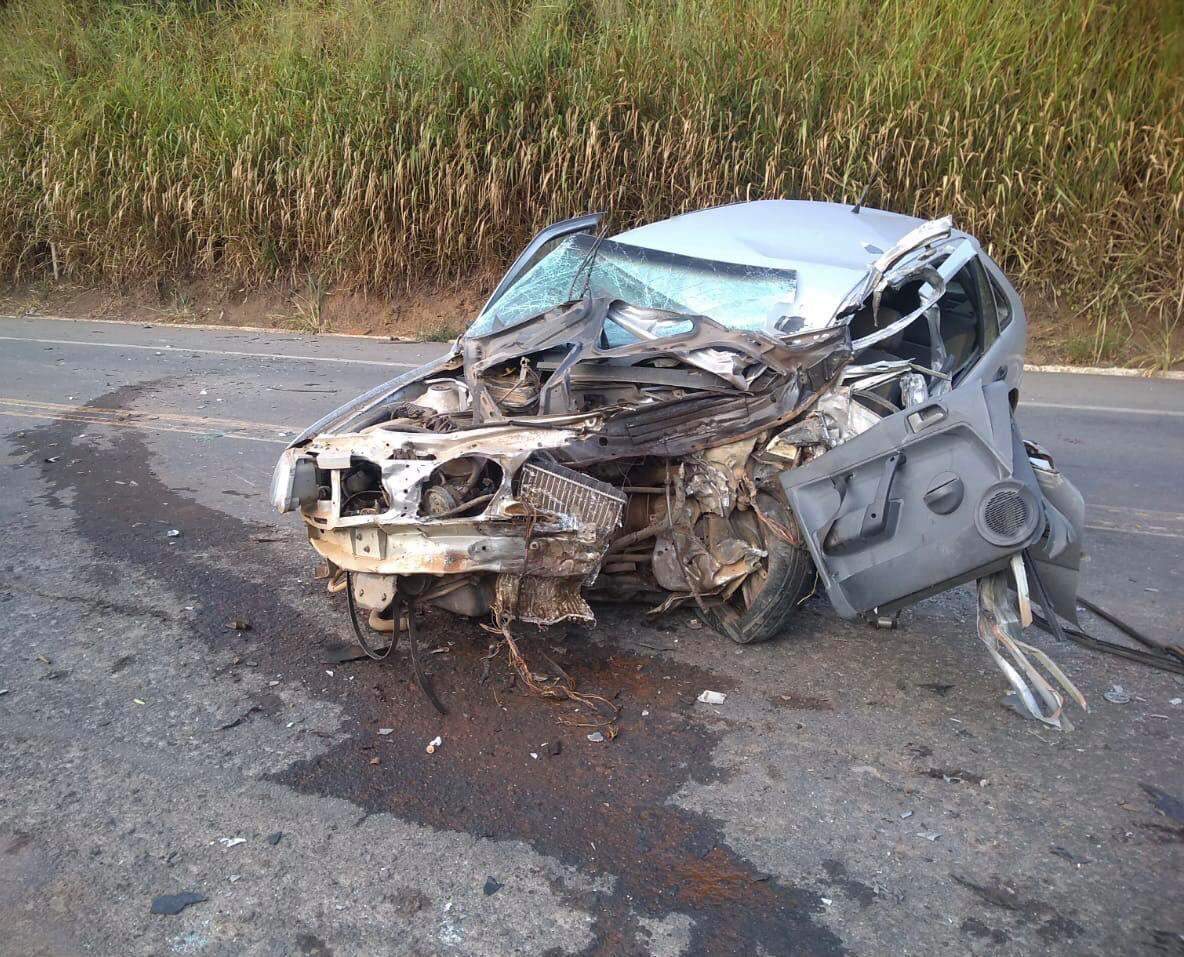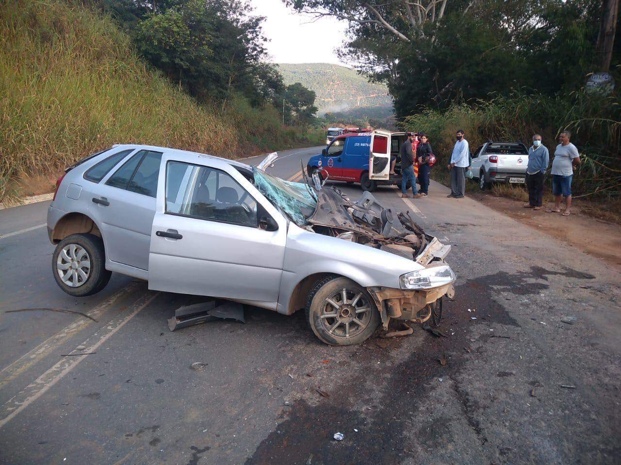 O Gol, com placa de Ipatinga, bateu no eixo traseiro de um caminhão. O carro ficou com a frente totalmente destruída.