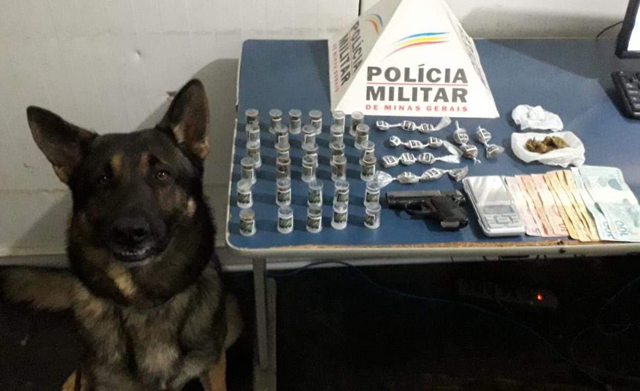 Policiais foram até a casa do adolescente. No local, os militares encontraram doze tubos de skank (também conhecida como supermaconha), 36 porções de maconha, uma porção de cocaína, uma balança digital, uma pistola calibre 635 e R$407,00.