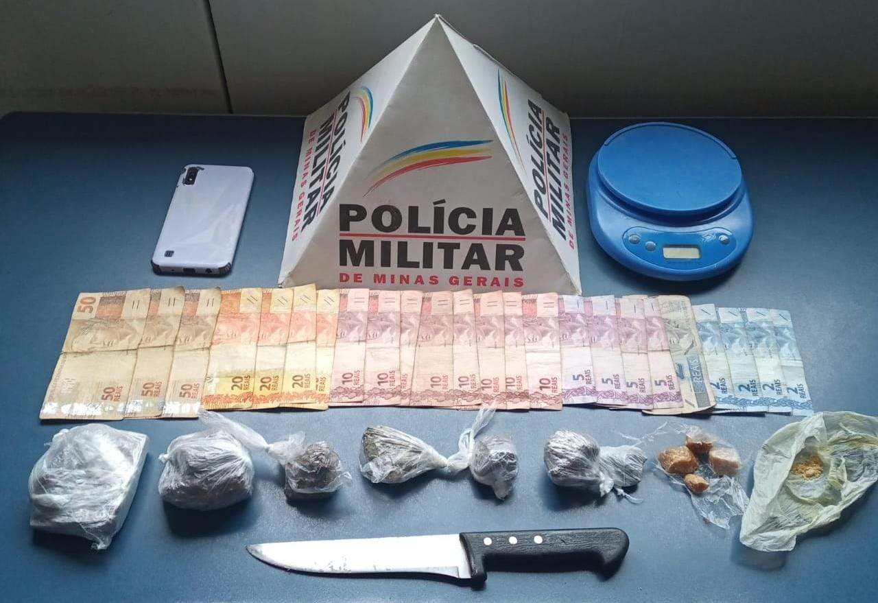 Durante as buscas, foram localizadas cinco pedras de crack, um tablete e 06 porções de maconha, uma balança de precisão, uma faca e R$ 340,00.