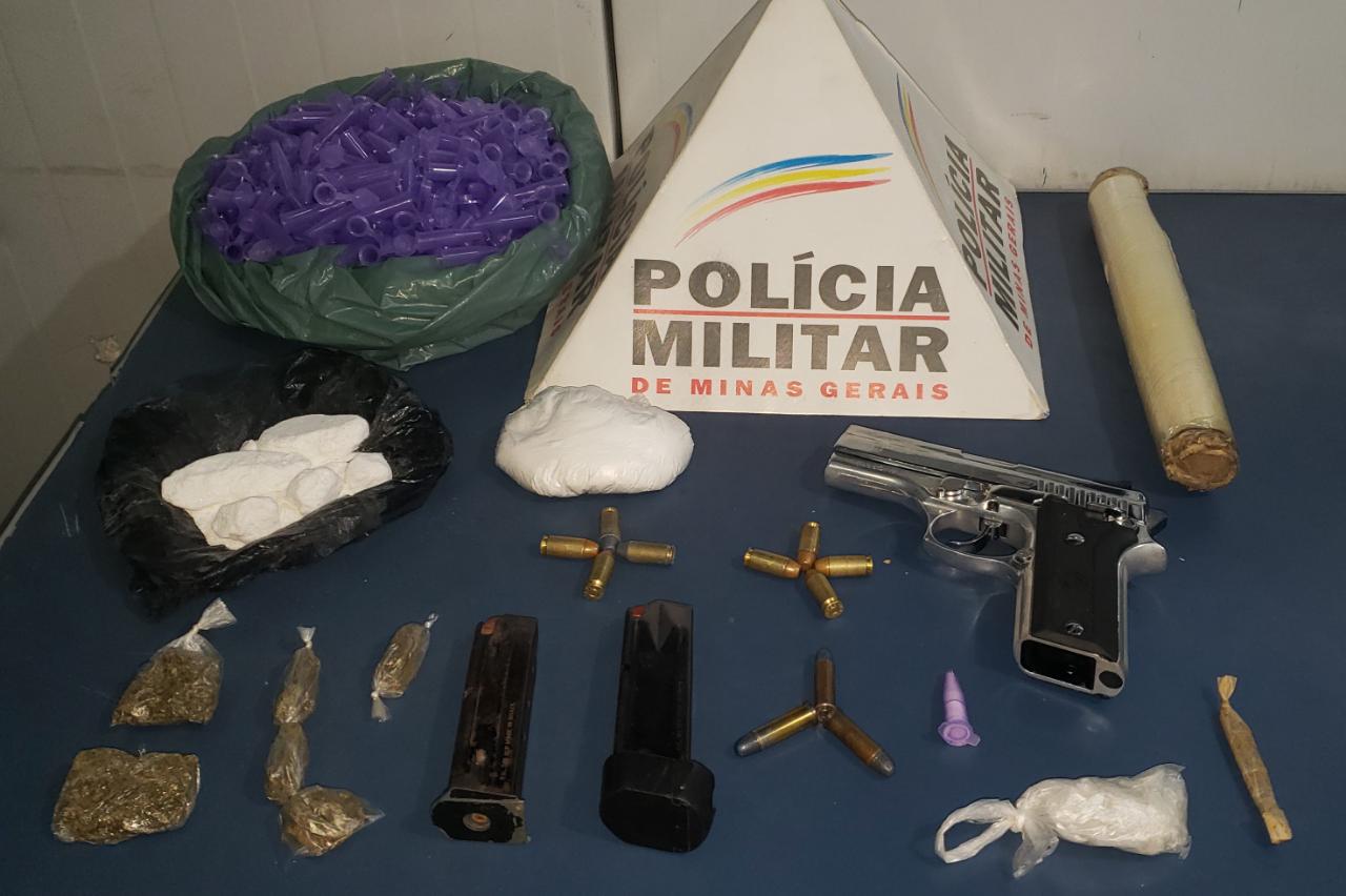Foi feito contato na residência do denunciado de 25 anos e durante as buscas foram localizadas 01 arma de fogo, tipo pistola, marca Taurus calibre .40, 02 carregadores, 05 buchas, 01 tablete e 01 cigarro de maconha, 01 ependorff e 02 invólucros com cocaína, 08 munições calibre .40 e 03 munições calibre 38, além de material para embalar as drogas.