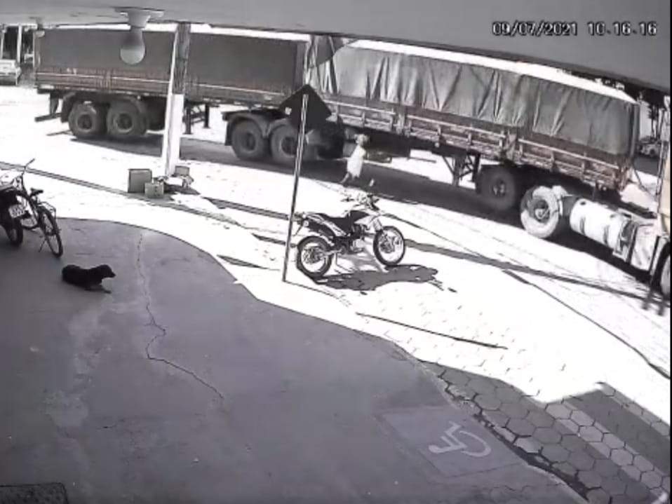 IPANEMA (MG) - No vídeo gravado pelo circuito de segurança é possível ver o momento em que Maria Eunice Paulina Gomes, de 61 anos, surge andando pela rua, quando na esquina da rua Arthur Bernardes com Avenida Sete de Setembro vai de encontro a uma carreta bitrem, que fazia conversão a direta para entrar na avenida. O acidente aconteceu na manhã desta quinta-feira (8), em Ipanema.