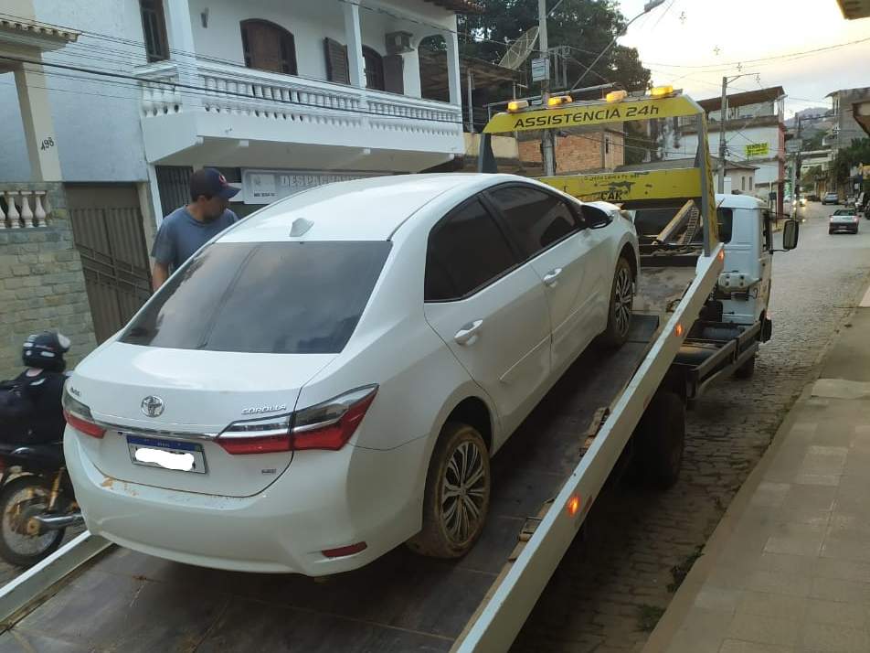 A informação era que o veículo Toyota Corolla, de cor branca e placas do Rio de Janeiro/RJ, poderia ter sinais de clonagem. O carro verdadeiro na garagem da proprietária e ela havia recebido uma multa de um local onde não esteve.