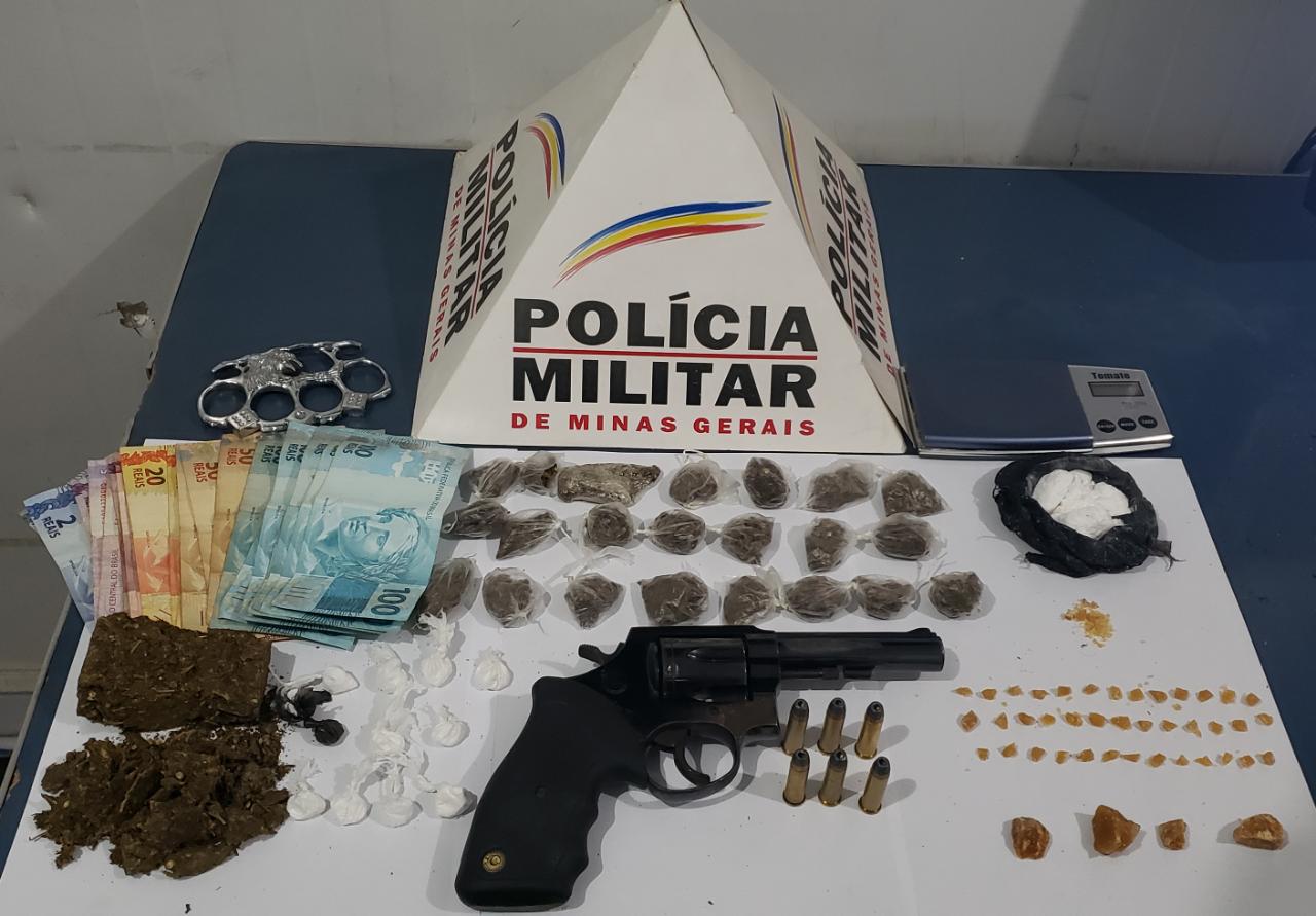 Os militares encontraram um revólver calibre 38 e seis munições, além de 01 balança de precisão, 11 papelotes de cocaína, 22 buchas, 01 porção grande e 01 tablete grande de maconha, 04 pedras brutas e 39 pedras menores de crack, além de R$1.139,00 em dinheiro.