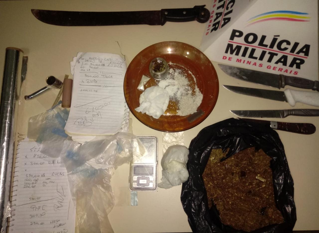 Com a chegada da equipe policial, o autor fugiu do local. Durante buscas no imóvel foram localizados um pacote com maconha e um com cocaína, além de facas, balança de precisão e materiais para embalar as drogas.