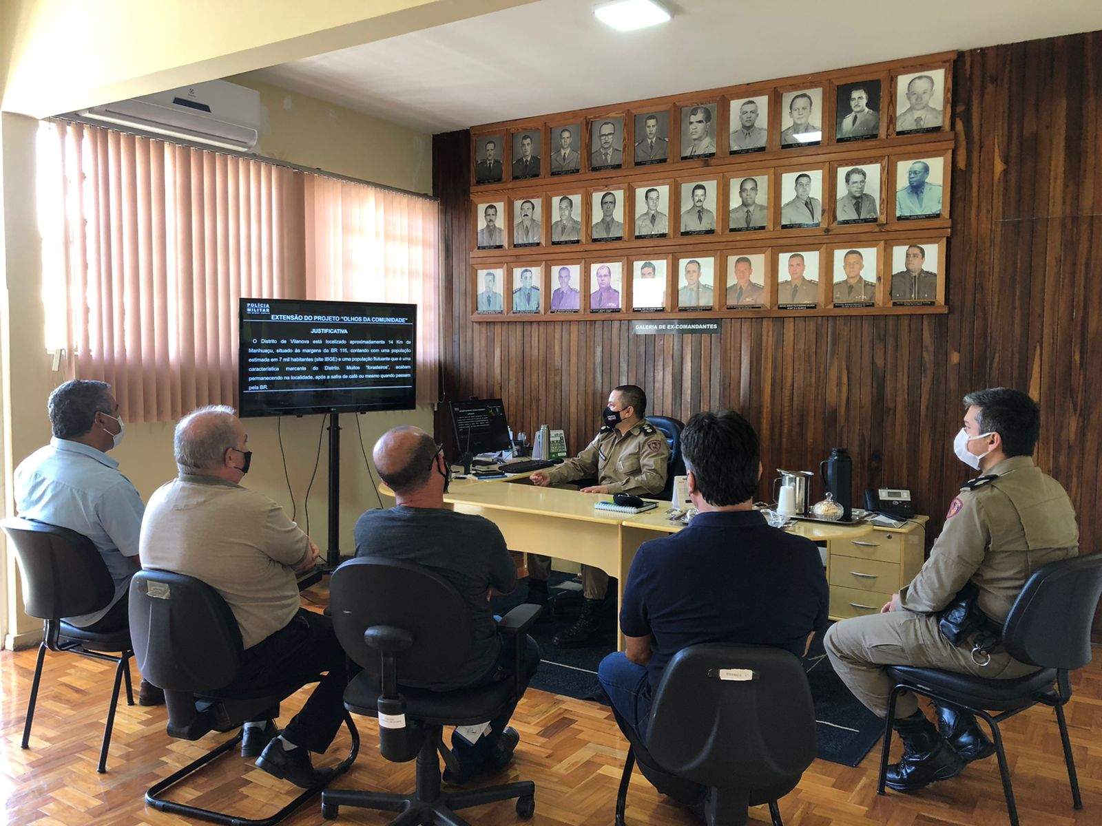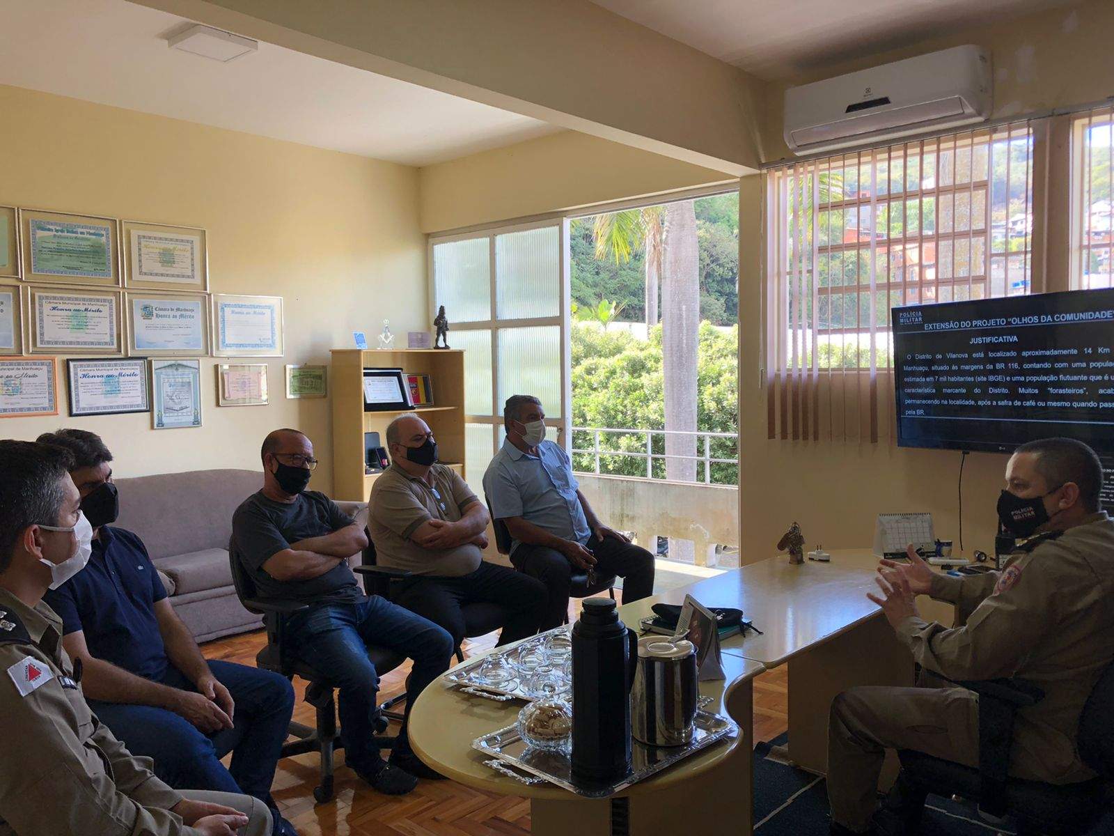 MANHUAÇU (MG) - Na manhã desta sexta-feria, 20/08, o Comandante do 11º Batalhão de Polícia Militar, Tenente Coronel Luciano Reis, acompanhado do 1º Tenente Vieira, comandante do Pelotão de Realeza, se reuniu com Vereadores de Manhuaçu, Jorge do Ibéria, Gilson César e Juninho Enfermeiro, e com o Secretário de Cultura da Prefeitura de Manhuaçu, Silvério Afonso, com o objetivo de buscarem alternativas da viabilização da implementação do projeto ‘Olhos da Comunidade’ para o Distrito de Vilanova.
