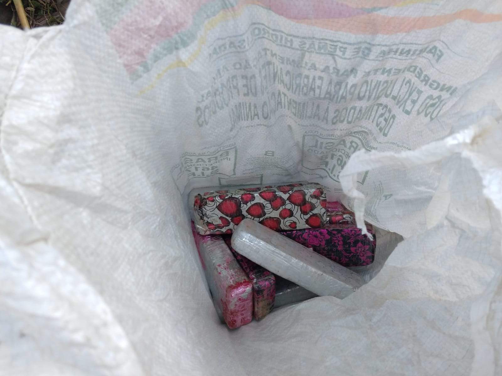 As equipes das Polícias Militar e Civil, com auxílio do cão de faro Kakau, fizeram buscas no local e conseguiram apreender nove tabletes de maconha que estavam escondidos em meio a vegetação em um saco de nylon.