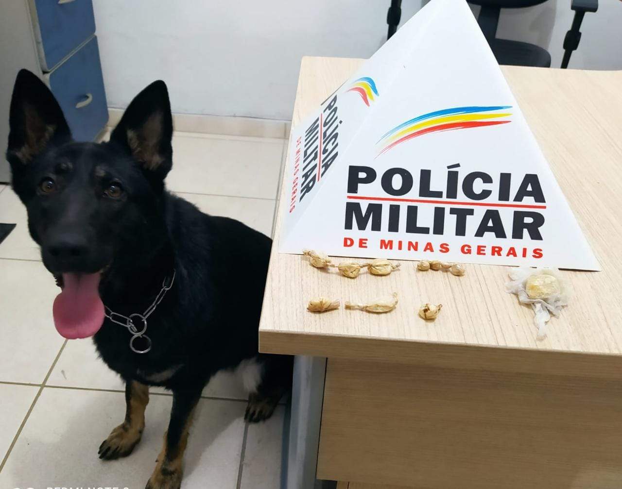 Foi aplicada a cadela de faro Kacau, sendo localizados 10 papelotes de cocaína e 01 pedra bruta de crack.