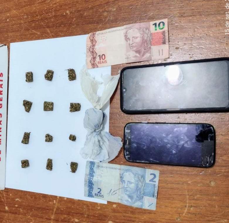 Militares receberam informação de que dois indivíduos estariam entregando drogas em um veículo Chevrolet Prisma. A equipe conseguiu abordar o veículo na Rua São João e foram localizados 12 tabletes e 01 bucha de maconha e R$12,00.