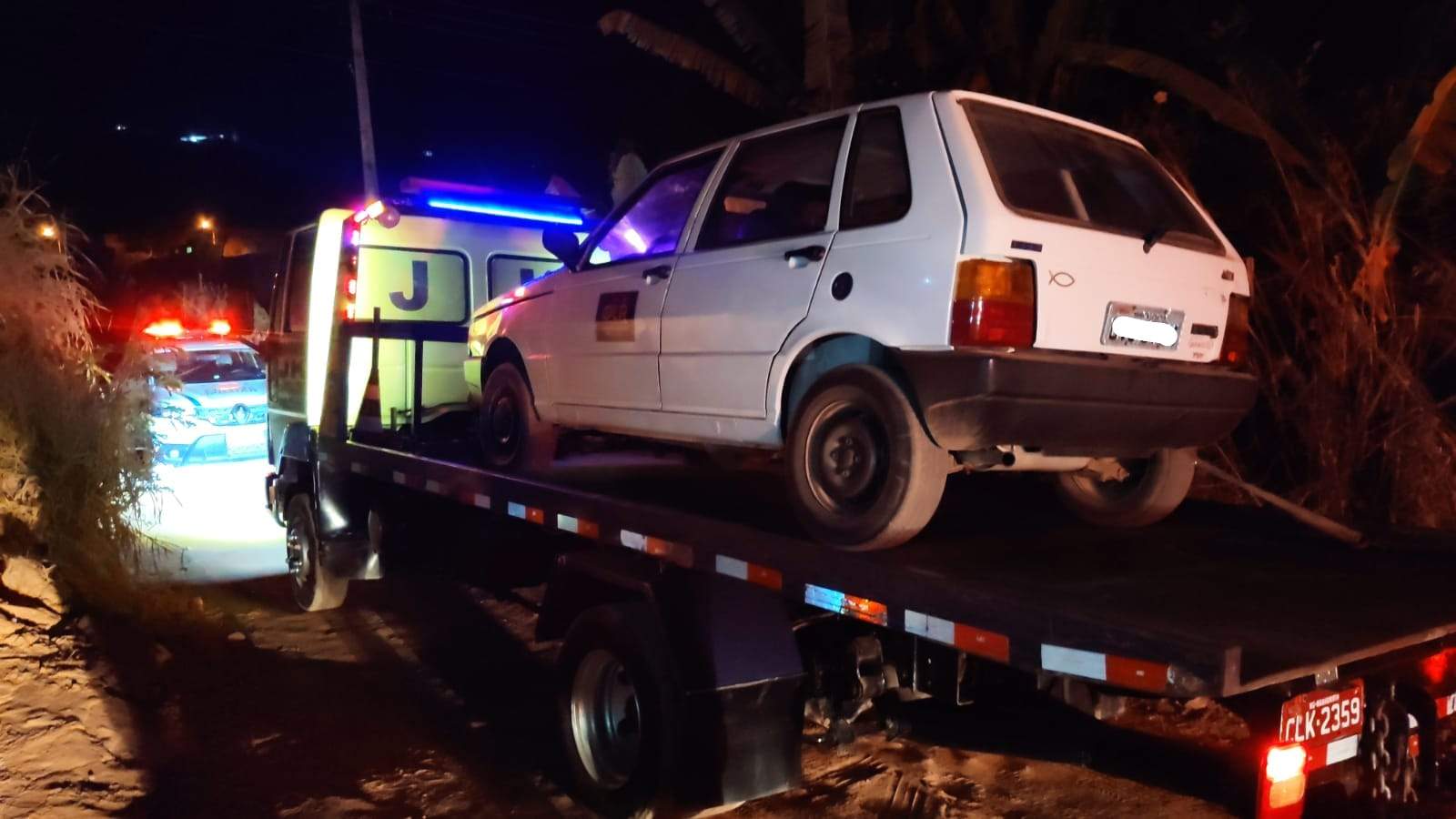 Os autores subtraíram R$ 900,00 e o veículo Fiat Uno da vítima. Após rastreamento o veículo foi localizado abandonado próximo à APAC, sendo este apreendido e removido ao pátio credenciado do Detran.