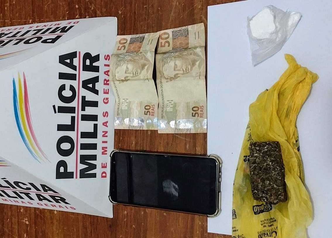 Os militares compareceram à casa do denunciado e, durante as buscas, foram localizados um tablete de maconha, cocaína e R$100,00.