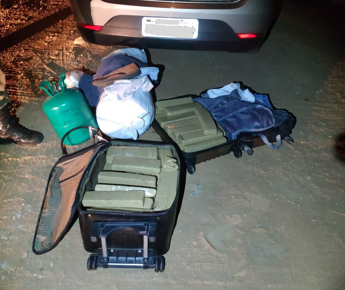 Foram localizadas 63 barras de maconha no porta-malas do veículo. Dentro do carro ainda havia quatro buchas de maconha, im pino de cocaína, um celular e R$ 32,00.