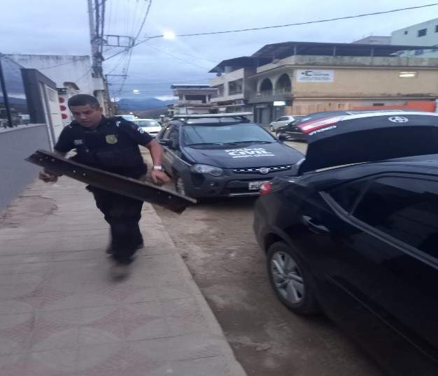 Durante as buscas, a Polícia Civil localizou e apreendeu o veículo Gol City, usado pelos criminosos para praticar o crime e um veículo Celta, adquirido como produto do crime, bem como foram localizados e apreendidos dois recortes de chassis, placas de identificação, plaquetas de motor, decalques de chassis, pertencentes a um caminhão da mesma marca e modelo daquele furtado por P.C.S em abril deste ano na cidade de Divino, objetos esses que estavam escondidos embaixo de um grande monte de madeira na propriedade do pai do suspeito e também investigado, no Córrego Capanema, zona Rural de Fervedouro, e em sobre o guarda-roupas da casa de sua companheira situada na cidade de Vermelho Novo.
