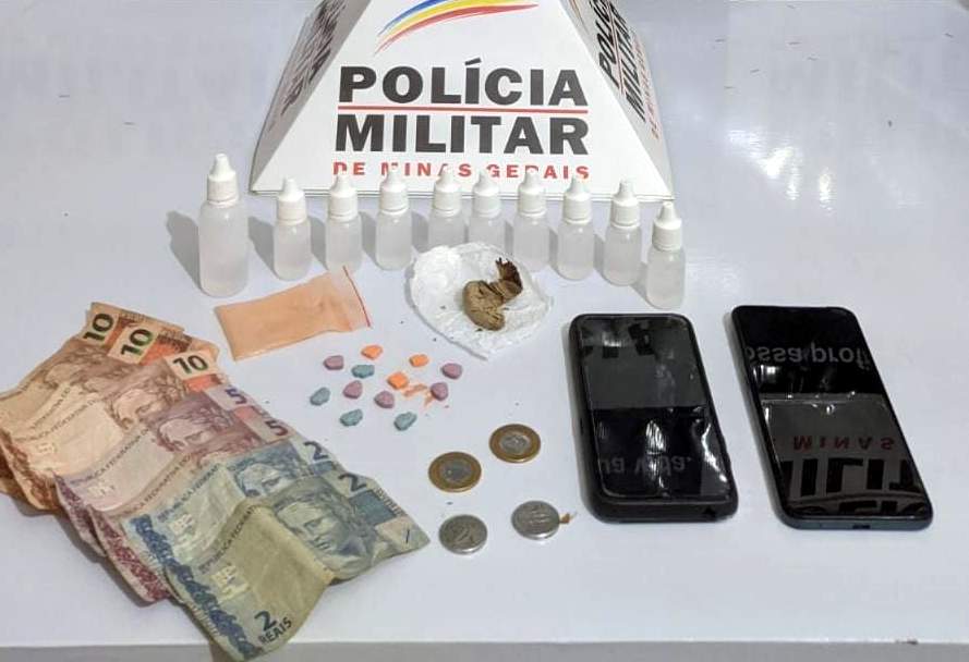 A equipe abordou um veículo de aplicativo no distrito com um casal oriundo da cidade de Mutum. Foram encontrados 12 comprimidos de ecstasy, 09 frascos de loló, 01 bucha de maconha e R$47,00.