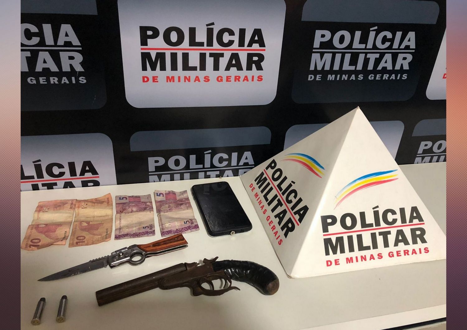 Equipes da PM iniciaram os levantamentos e conseguiram abordar o menor infrator na Rua Herondino Pereira Xavier. Ele carregava a garrucha, calibre 38, com 02 munições, utilizada no roubo, além da quantia de R$ 30,00. O aparelho celular roubado também foi localizado jogado próximo a uma caçamba de lixo.