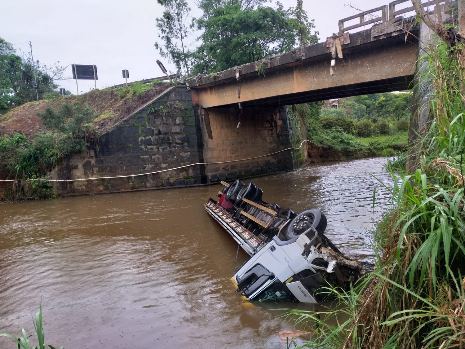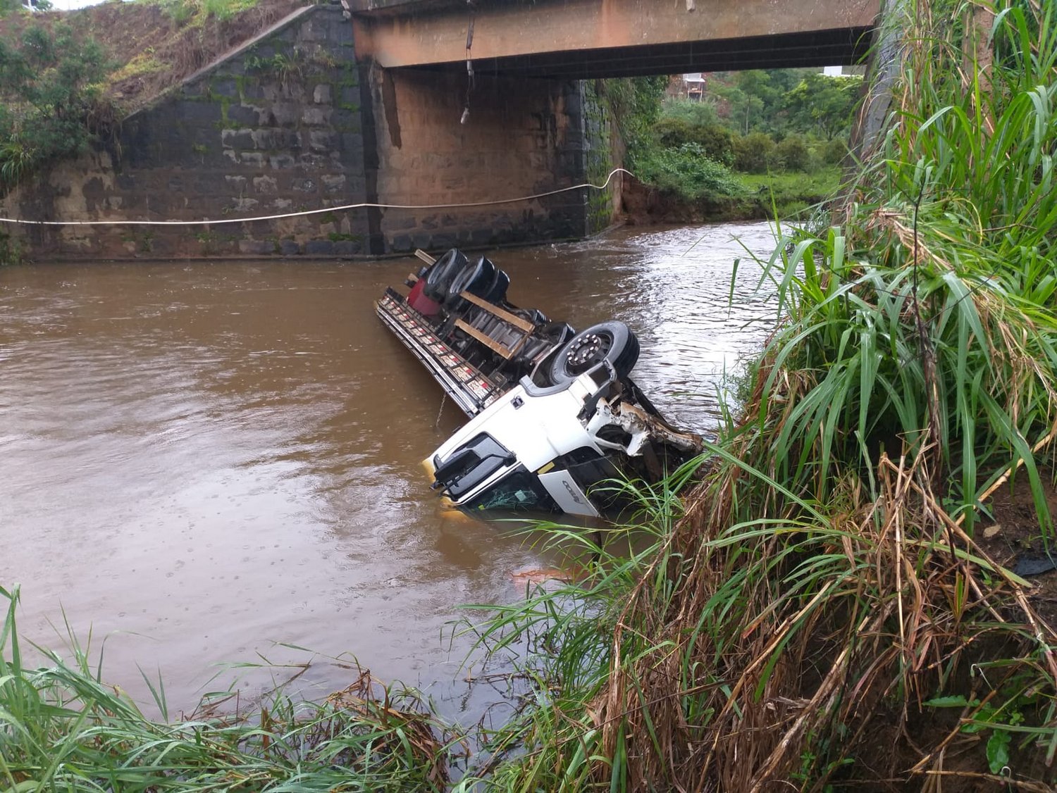 MANHUAÇU (MG) - Motoristas que trafegam pela BR 116, entre Realeza e São João do Manhuaçu, nesta quinta-feira, 11/11, devem ficar atentos ao trecho da ponte de Bom Jesus do Realeza, sobre o rio Manhuaçu. Equipes da Via Minas estão no local retirando um caminhão que saiu da pista e caiu dentro rio.