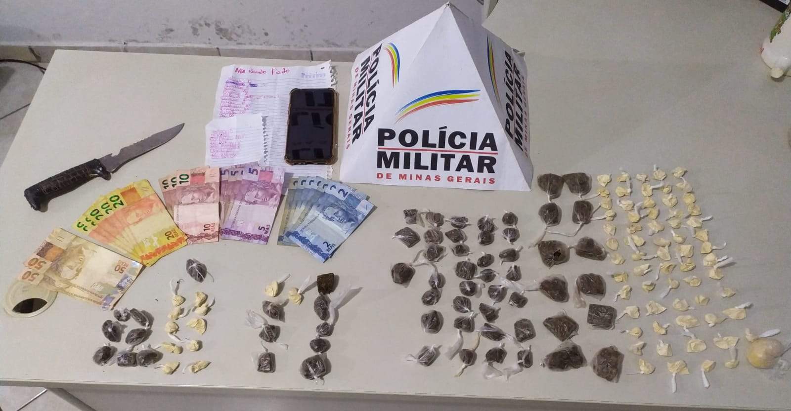No local, com apoio da equipe policial da cidade de Espera Feliz foi realizado monitoramento e abordagem na residência. Durante as buscas foram localizadas 61 buchas de maconha, 77 papelotes de cocaína, 01 faca, anotações do tráfico e R$ 264,00.