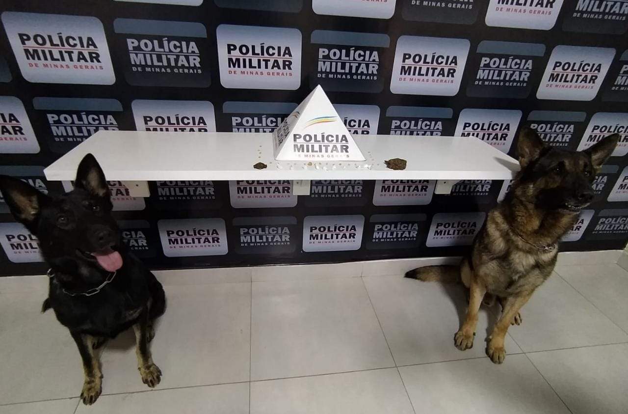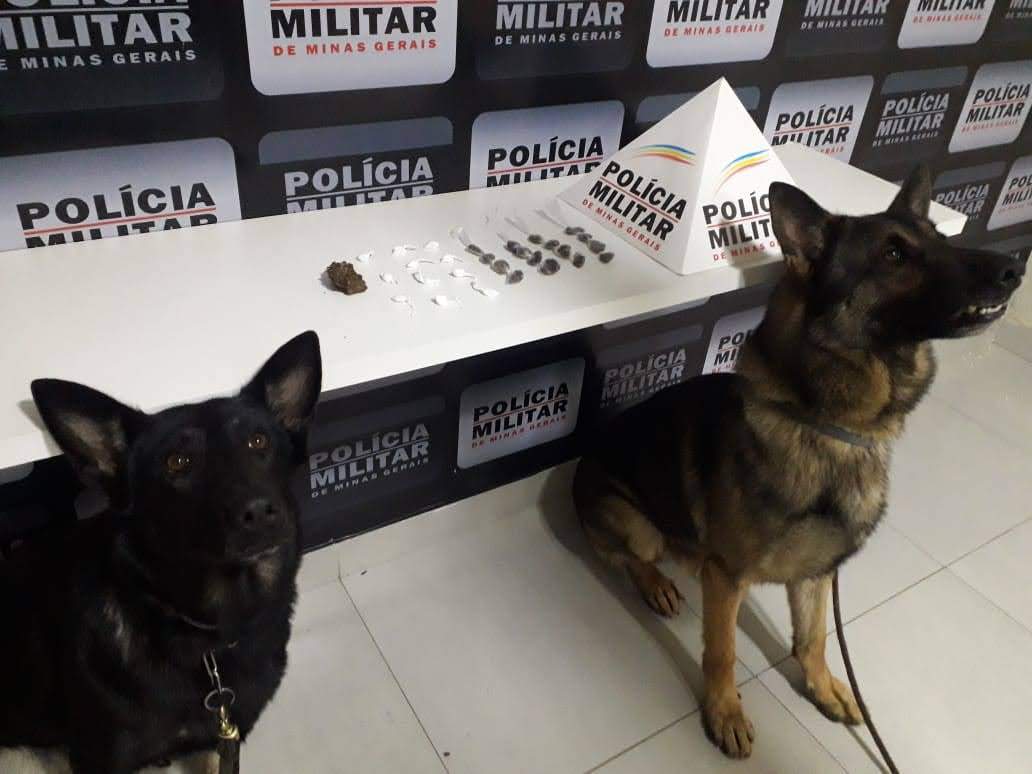 Com a aplicação dos cães de faro foram encontrados 02 tabletes de maconha, 10 papelotes de cocaína e 25 pedras de crack.