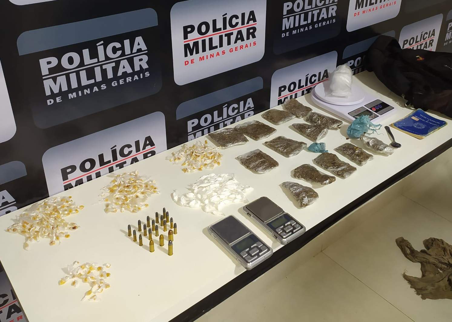 Já as drogas foram apreendidas na Rua Caparaó bairro Santana. Sendo um total de 327 pedras de crack, 67 papelotes de cocaína, 12 tabletes e 05 buchas de maconha, além de 20 munições de calibres diversos e outros materiais utilizados para a traficância de drogas no bairro. Uma adolescente de 16 anos foi apreendida e uma mulher de 36 anos figura como suspeita da propriedade da droga no registro da ocorrência.