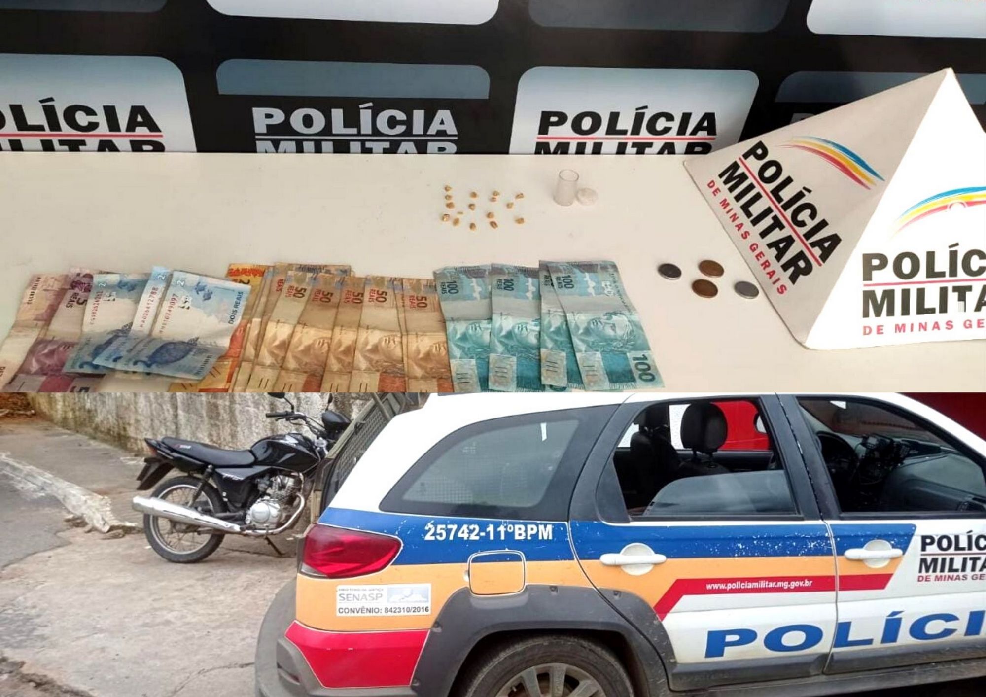 Durante as buscas foi localizado um pote contendo 16 pedras de crack, prontas para serem comercializadas e R$1.329,00.