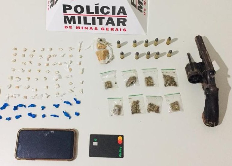Durante as buscas com apoio da equipe ROCCA foi localizada a arma, sendo 01 revólver calibre 38, 10 munições do mesmo calibre, 76 pedras de crack e 08 buchas de maconha.