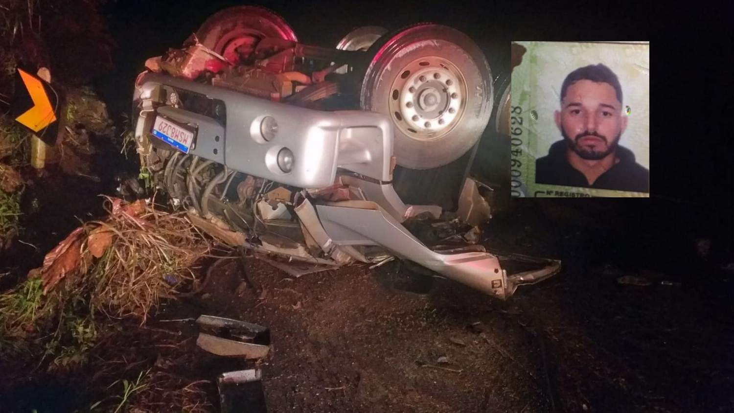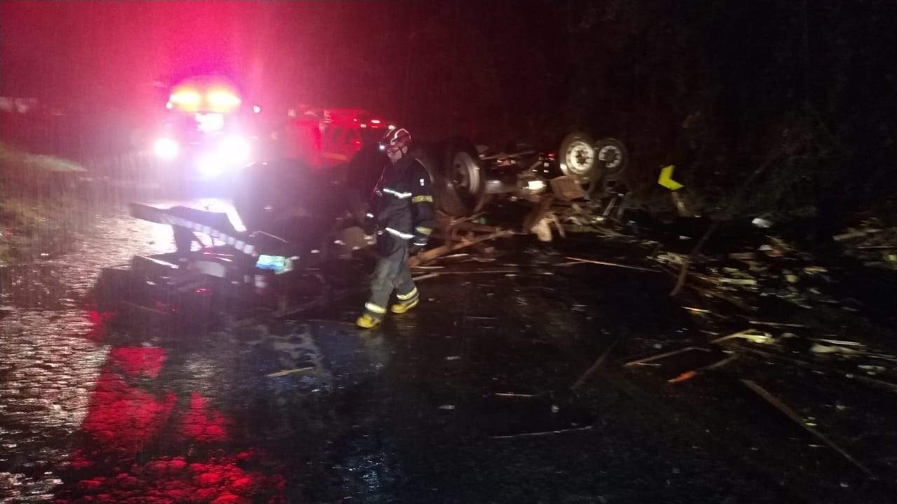 O caminhão de Castelo (ES) transportava granito. O motorista ficou preso na cabine. O Corpo de Bombeiros constatou que ele morreu no local.