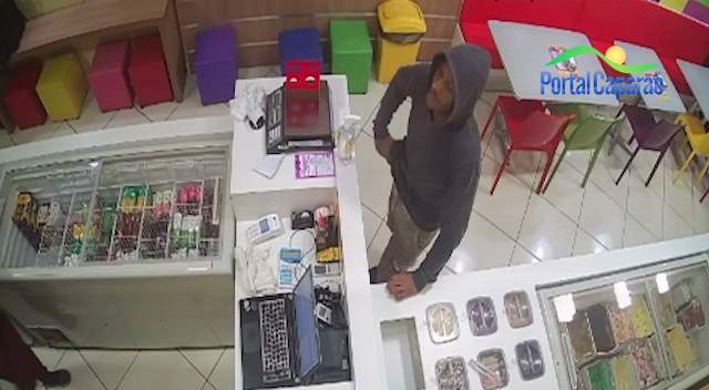 O autor trajava uma camisa de manga comprida com capuz, na cor azul e bermuda clara e tênis preto. As equipes policiais analisaram as imagens das câmeras de monitoramento e conseguiram identificar o autor do roubo. Trata-se de Marlon de Oliveira, que deveria estar se recolhendo ao presídio todas as noites. Ele não foi na terça e nem nesta quarta.