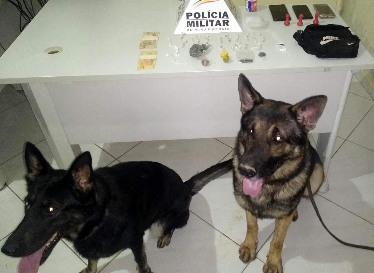 Com os cães de faro Aquiles e Kacau foram encontradas 77 pedras de crack, 05 buchas de maconha, 09 papelotes e 01 pote com cocaína, 01 simulacro de arma de fogo e R$70,00.