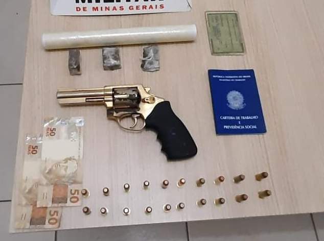 Foram apreendidos um revólver calibre 38 e 20 munições, além de três tabletes pequenos de maconha prensada, cem reais, rolo de plástico filme, caderno com anotações diversas.