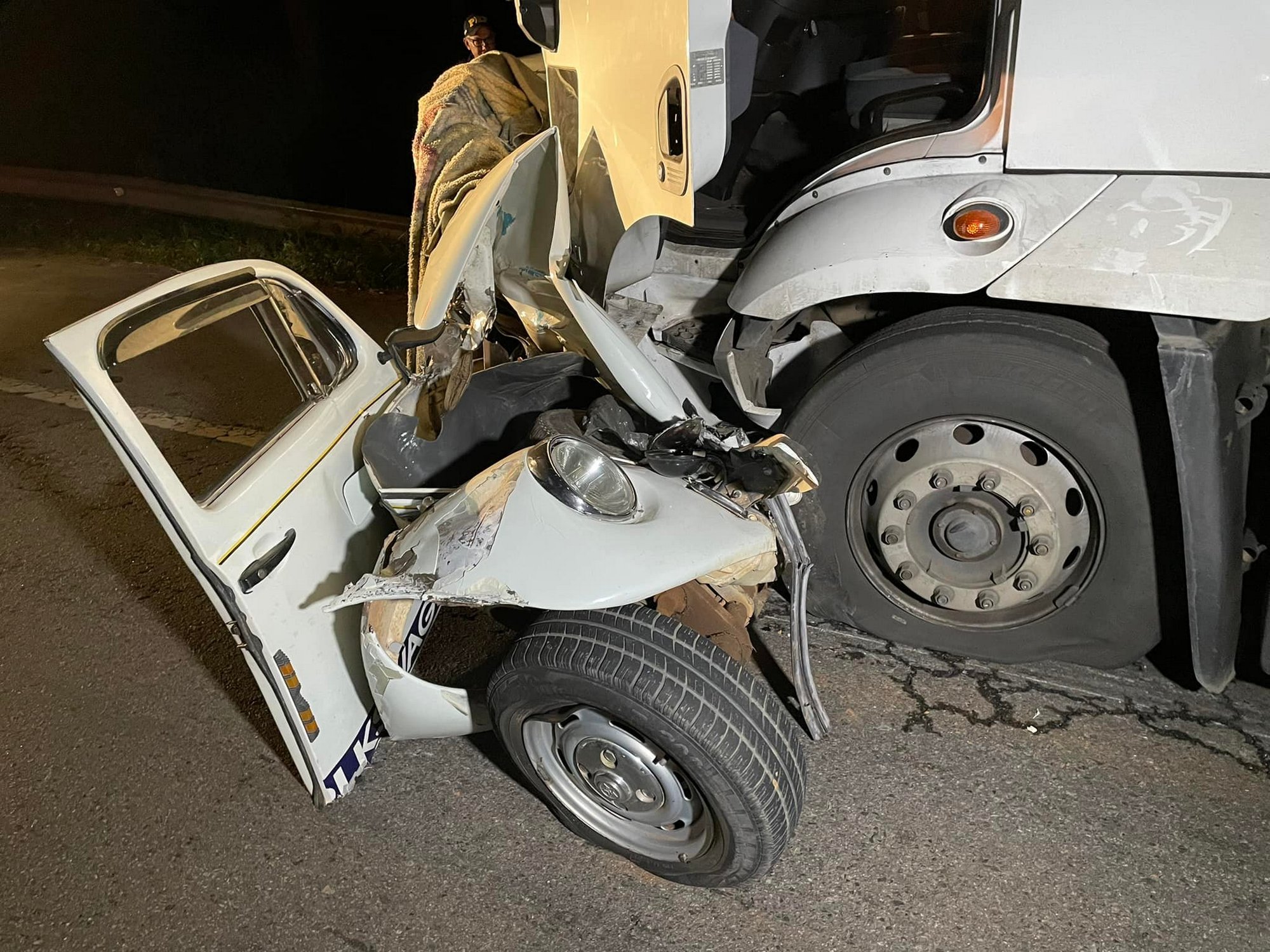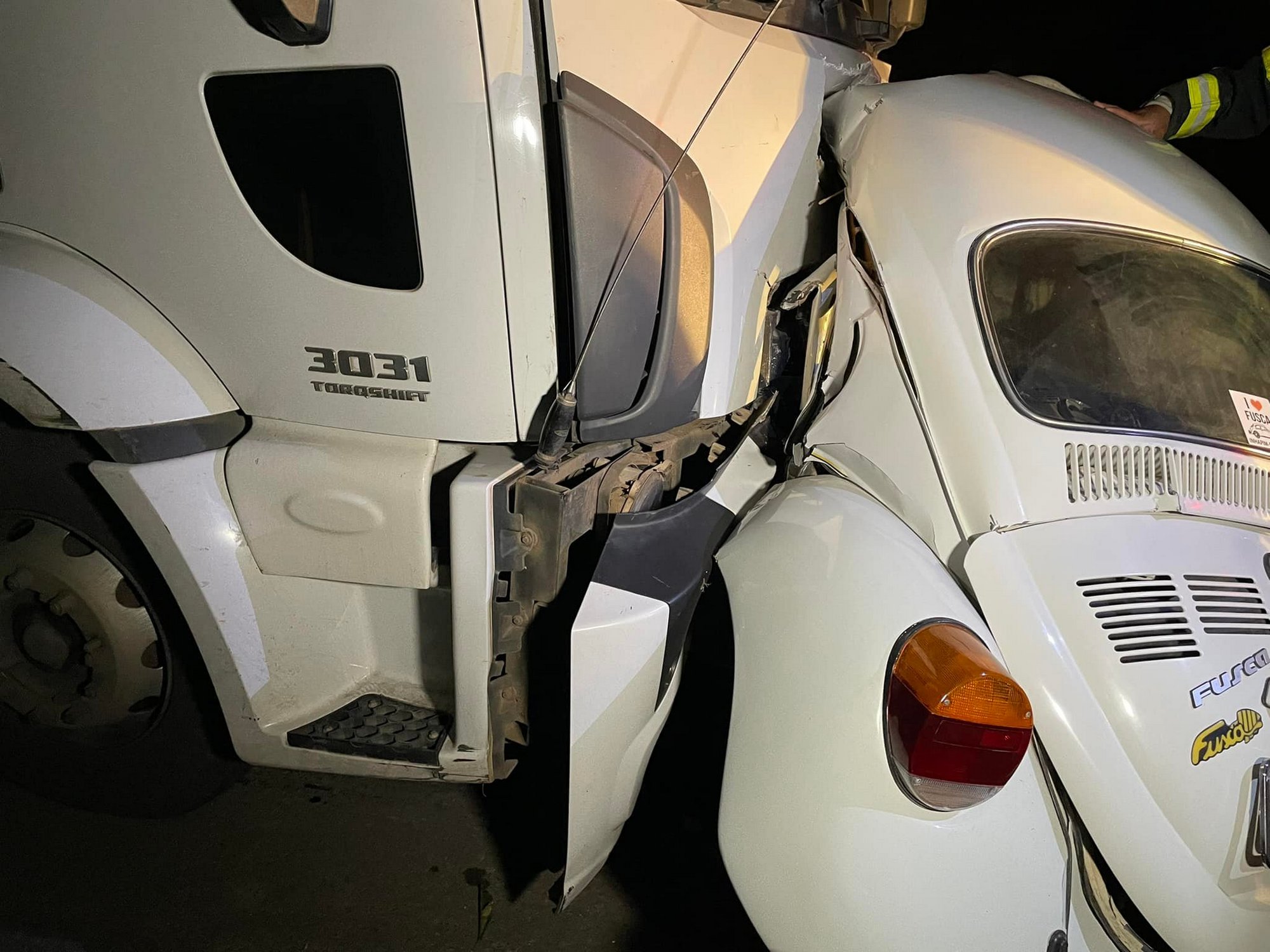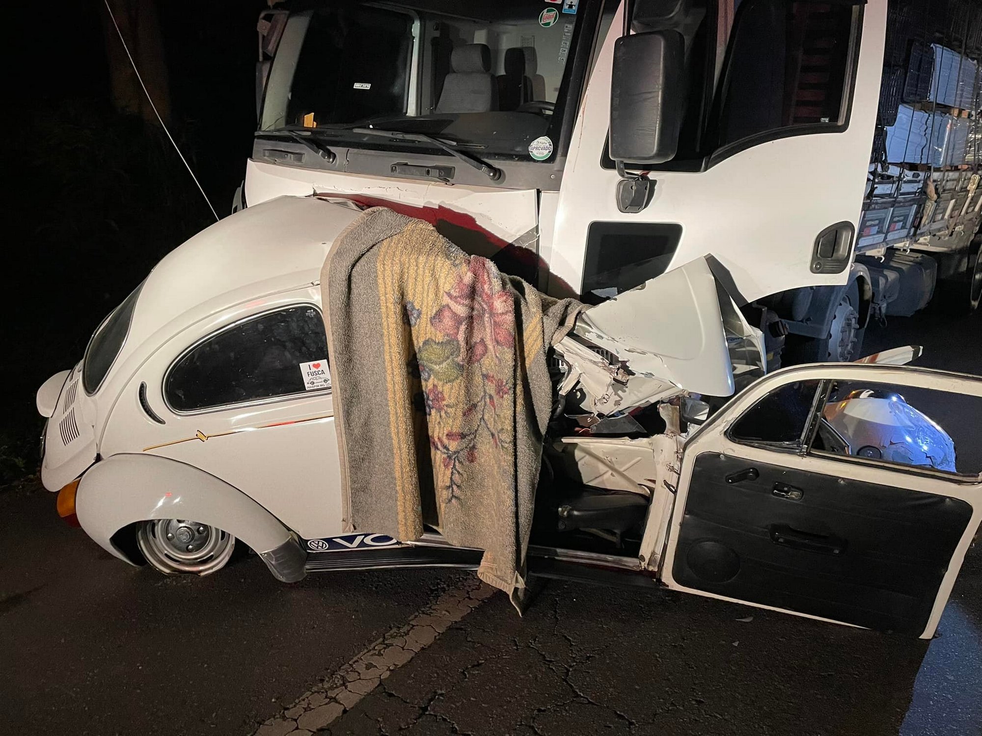 INHAPIM (MG) - Homem morre na hora em colisão entre Fusca e caminhão na BR-116, em Inhapim.O acidente fatal foi registrado na madrugada deste domingo (03/04) no KM 545 da BR-116, próximo ao Posto Faisão, em Inhapim. A lateral direita do veículo Volkswagen Fusca ficou completamente destruída e esmagada na forte colisão com o caminhão.