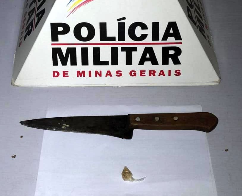 Foi localizada na cintura do autor uma faca de cozinha e, próximo a ele, uma pedra de crack, que tentou dispensar ao fugir da equipe.