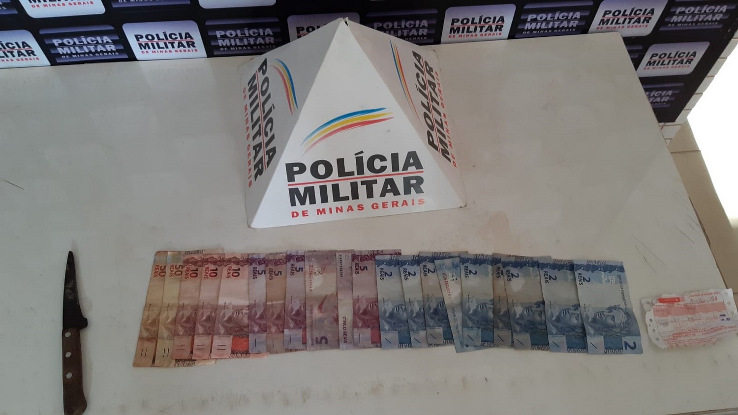 A quantia em dinheiro foi recuperada e a faca utilizada no crime apreendida. Material apreendido e recuperado juntamente com o indivíduo foi encaminhado à Delegacia de Polícia Civil para as devidas providências.